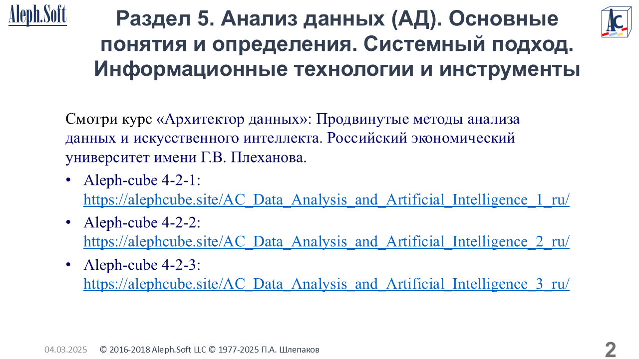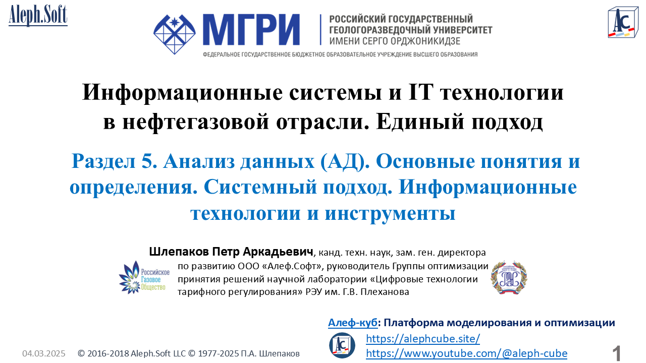 Aleph-cube 9-5-5: Информационные системы и IT технологии в нефтегазовой отрасли. Единый подход. Российский государственный геологоразведочный университет (МГРИ). Нефтегазовый факультет. Раздел 5. Анализ данных. Основные понятия и определения. Системный подход. Информационные технологии и инструменты. 2025.
