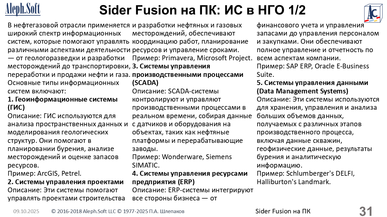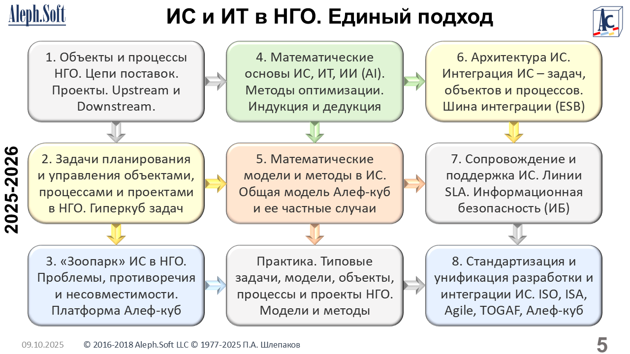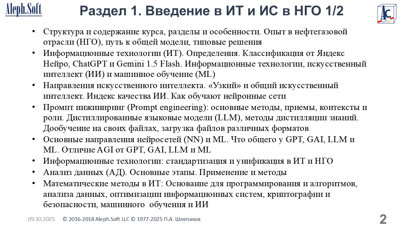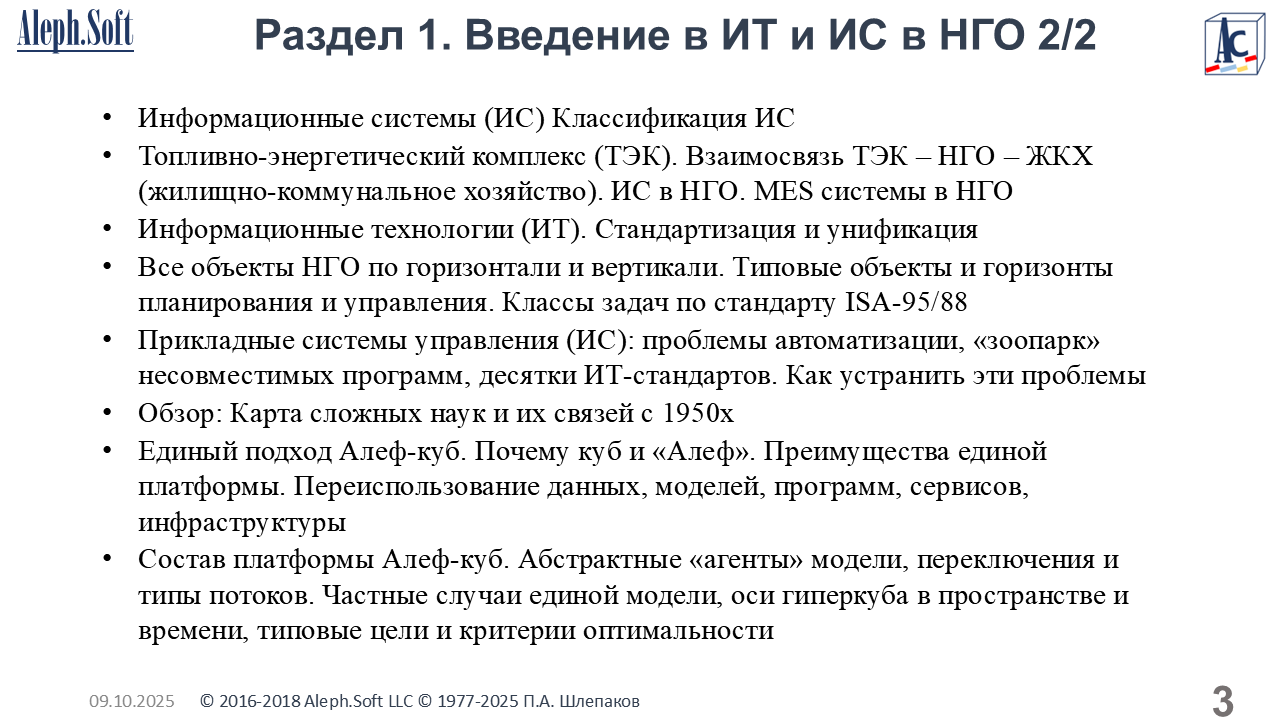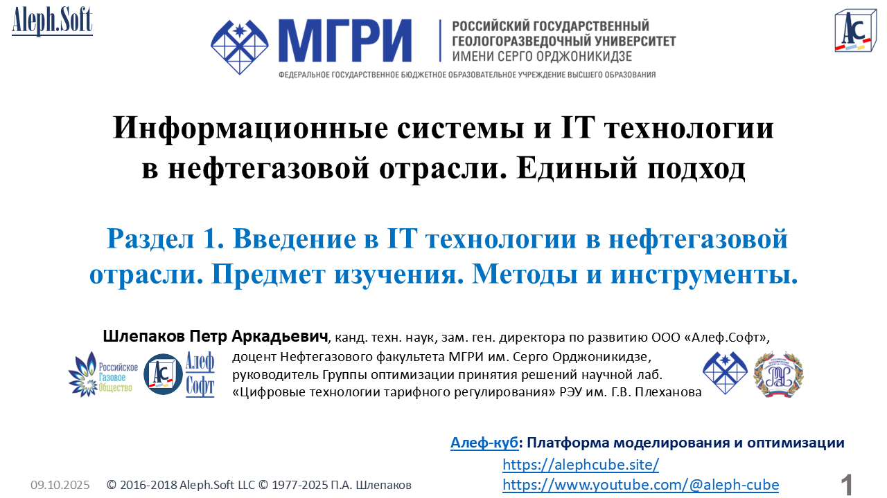 Aleph-cube 9-5-1: Информационные системы и IT технологии в нефтегазовой отрасли. Единый подход. Российский государственный геологоразведочный университет (МГРИ). Нефтегазовый факультет. Раздел 1. Введение в информационные технологии (ИТ) в нефтегазовой отрасли (НГО). Предмет изучения. Методы и инструменты. 2025.