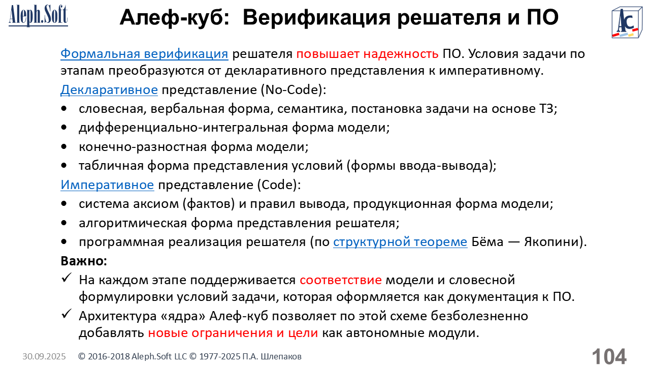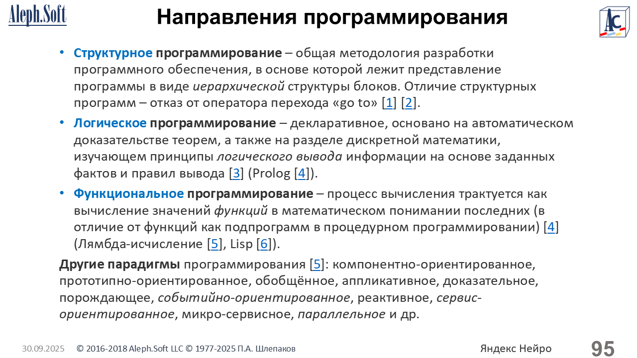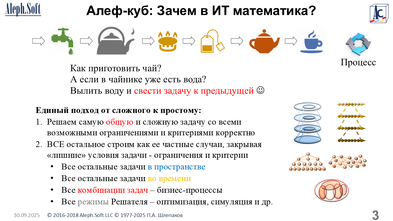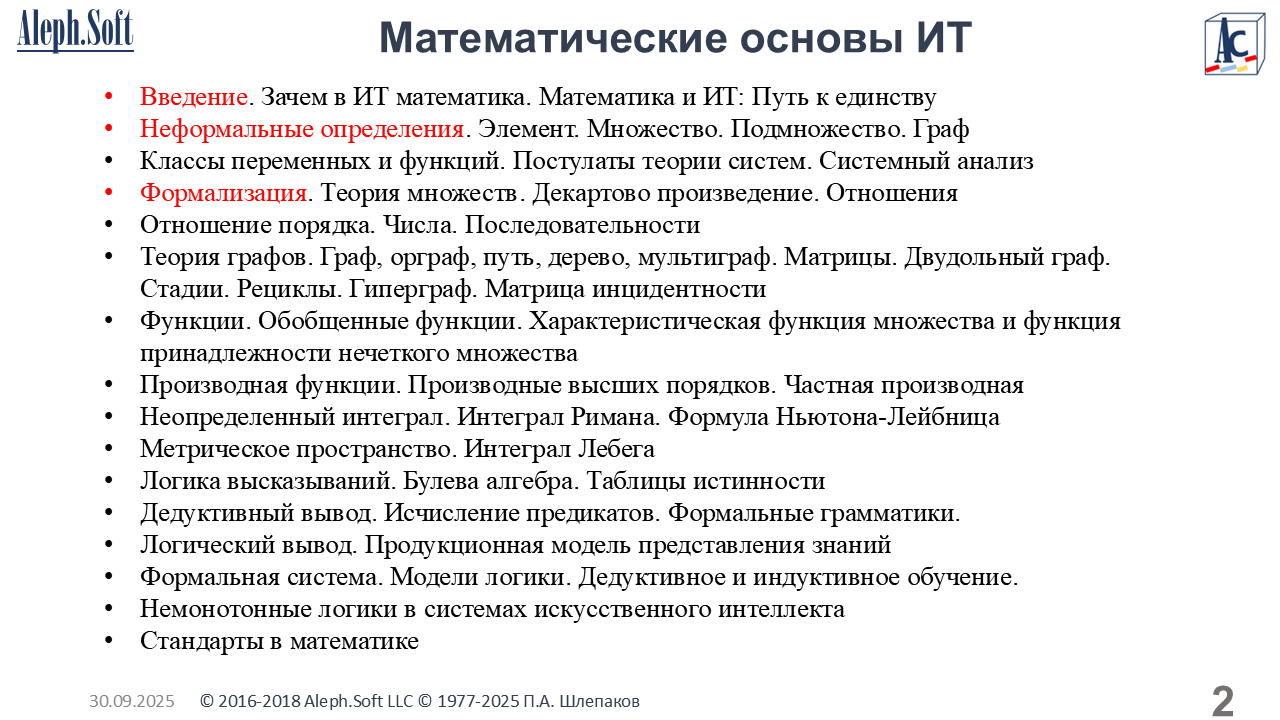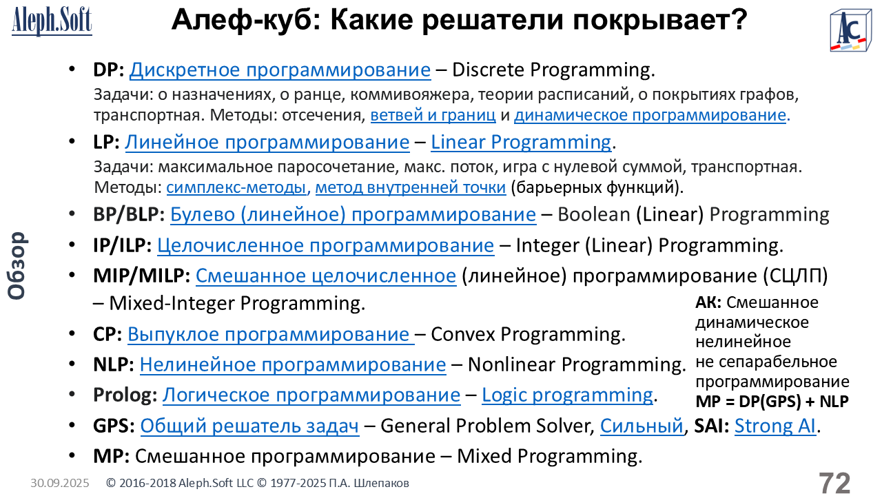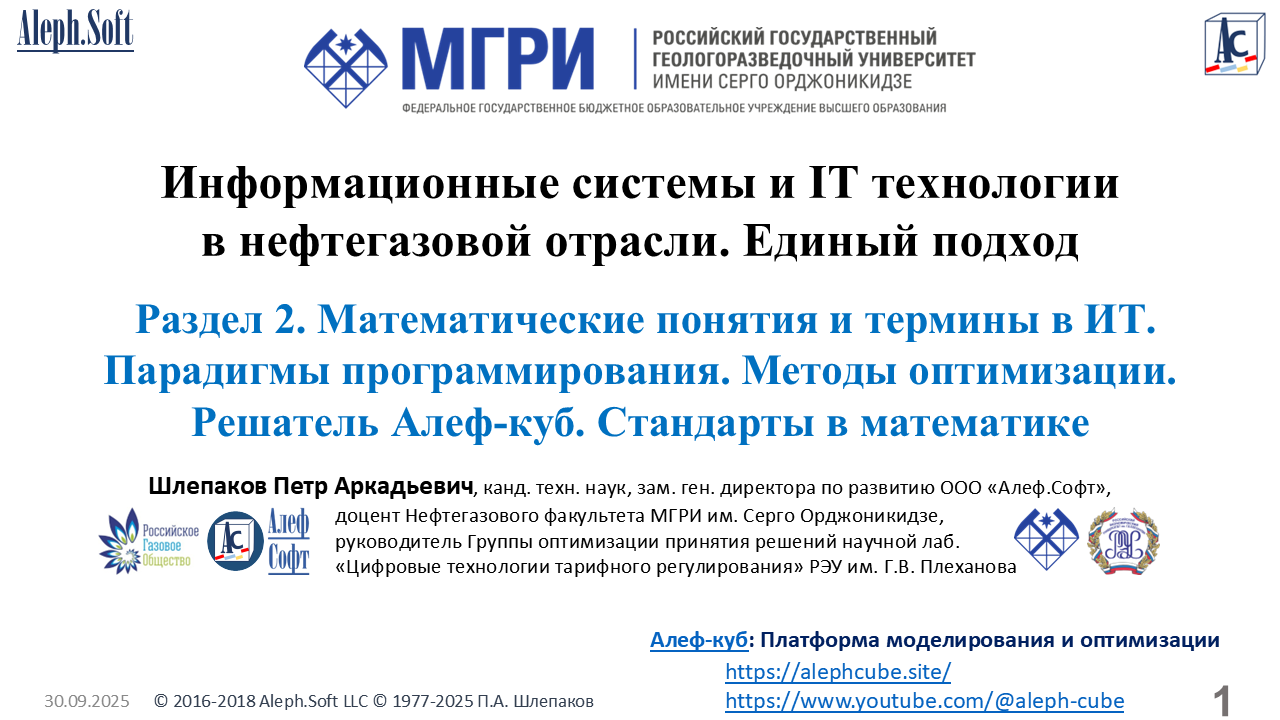 Aleph-cube 9-5-2: Информационные системы и IT технологии в нефтегазовой отрасли. Единый подход. Российский государственный геологоразведочный университет (МГРИ). Нефтегазовый факультет. Раздел 2. Математические понятия и термины в ИТ. Парадигмы программирования. Методы оптимизации. Решатель Алеф-куб. Стандарты в математике. 2025.