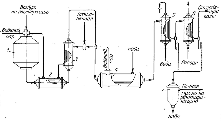 Смесь этилбензола и водяного пара направляют в испаритель 3, обогреваемый контактными газами, и затем в перегреватель 2. Отсюда при температуре 530 C смесь подают в адиабатический реактор; тепло, необходимое для дегидрирования, подводится с перегретым водяным паром. Тепло контактных газов используется в испарителе, перегревателе и котле-утилизаторе для получения водяного пара. На выходе из котла-утилизатора контактные газы последовательно поступают в конденсаторы 5 и 6, охлаждаемые водой и рассолом. Конденсат собирают в отстойнике 7, где углеводороды отделяются от воды. Несконденсировавшиеся газы направляют на использование в качестве топлива.