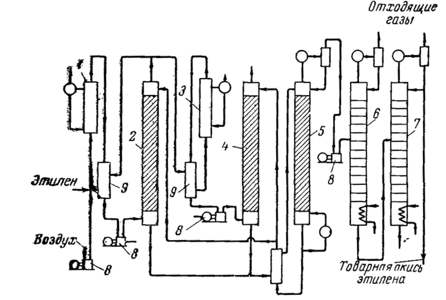 Очищенные от примесей воздух и этилен смешиваются с рециркулирующим газом и поступают в основной реактор 1 (реактор первой ступени). Выходящие горячие газы, пройдя теплообменник 5, нагревают рециркулирующие газы, сжимаются компрессором 8 и поступают в основной абсорбер 2 (абсорбер первой ступени), в котором окись этилена и образующиеся в качестве побочных продуктов незначительные количества ацетальдегида и часть двуокиси углерода поглощаются водой. После абсорбера 2 большая часть газов возвращается в цикл на смешение со свежим этиленом и воздухом, а остальные газы после нагревания в теплообменнике смешиваются с добавочным количеством воздуха и поступают в дополнительный реактор 3 (реактор второй ступени). Добавочное количество воздуха вводится для более полного окисления этилена в реакторе 3. Отвод образующегося тепла из обоих реактаров производится циркулирующим теплоносителем, который, в свою очередь, отдает тепло кипящей воде. Таким образом, теплота реакции используется для получения водяного пара.