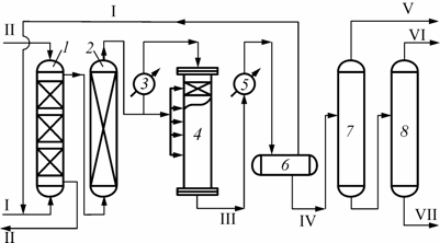 1 — скруббер; 2 — адсорбер; 3 — теплообменник; 4 — реактор синтеза; 5 — холодильник; 6 — сепаратор; 7, 8 — ректификационные колонны К-7 и К-8; I — синтез-газ; II — вода; III — реакционные газы; IV — метанол-сырец; V — диметиловый эфир; VI — метанол; VII — высшие спирты