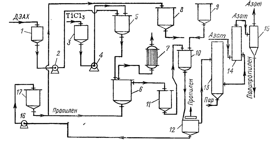 1 – мерник диэтилалюминийхлорида; 2, 4, 16 – дозирующие насосы; 3 – мерник трихлорида титана; 5 – смеситель катализаторного комплекса; 6 – полимеризатор; 7 – конденсатор; 8 – отстойник водной фазы; 9 – сборник суспензии полимера; 10 – аппарат для разложения остатков катализатора; 11 – сборник промывного раствора; 12 – фильтр; 13 – отводная колонка; 14 – сушилка; 15 – циклонный сепаратор; 17 – нейтрализатор продуктов разложения остатков катализатора.