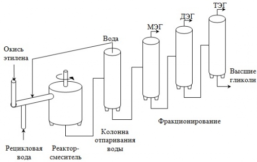 Процесс проводят в нейтральной среде под давлением 10≈12 кгс/см2 при 160≈180 °С в непрерывно действующем автоклаве, который представляет собой стальную колонну высотой 10 м и диаметром 1 м. Раствор, выходящий из автоклава, упаривают в двух- или трехкорпусном выпарном агрегате и фракционируют. В процессе производства моноэтиленгликоля получаются также ди- и триэтиленгликоли.