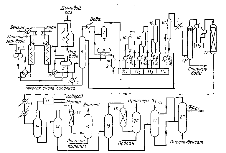1 — теплообменные аппараты; 2 — барабан-паросборник; 3 — закалочно-испарительные аппараты; 4 — печи пиролиза бензина; 4а — течь пиролиза этана; 5 — пароперегреватель; 6 — колонна первичного фракционирования; 7 — сепаратор; 8 — отстойник; 9 — отпарная колонна; 10 — сепараторы; 111-5- компрессоры 1—5 — ступени; 12 — колонна щелочной очистки; 13 — осушители; 14 — деметанизатор; 15 — холодный блок; 16 — этан-этиленовая колонна; 17 — реакторы гидрирования; 18 — деэтанизатор; 19 — пропан-пропиленовая колонна; 20 — депропанизатор; 21 — дебутанизатор; 22 — депентанизатор.