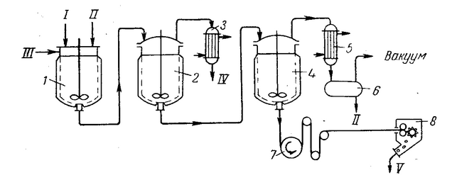 1 – автоклав для растворения диметилтерефталата; 2 – автоклав для переэтерификации; 3 – конденсатор метанола; 4 – автоклав для поликонденсации; 5 – конденсатор для этиленгликоля; 6 – приемник гликоля; 7 барабан; 8 – рубильная машина. I – диметилтерефталат; II – элтиленгликоль; III – катализатор; IV – метанол; V – крошка полимера.