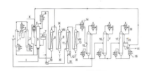 1, 3, 15 – 17 – ректификационные колонны; 2 – флорентийский сосуд; 4 – реактор приготовления катализатора; 6 – конденсатор; 7 – сепаратор жидкость-жидкость; 8, 9, 11, 13 – скрубберы; 10, 12 – насосы; 14 – подогреватель; 18 – вакуум-приемник; 19 – холодильник полиалкилбензолов; I – этилен; II – бензол; III- диэтилбензолы; IV- раствор щелочи; V- этилбензол; VI – полиалкилбензолы; VII – к вакуумной линии; VIII – вода; IX – газы на факел; X – этилхлорид и хлорид алюминия; XI – сточные воды.