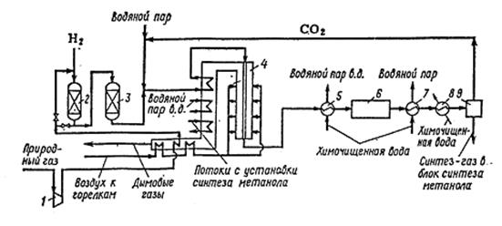 1 – компрессор; 2 – реактор гидрирования сернистых соединений; 3 – реактор очистки от сероводорода; 4 – печь конверсии; 5,7 – котлы-утилизаторы; 6 – кипятильники отделения ректификации метанола-сырца; 8 – подогреватель питательной воды; 9 – очистка от СО2.