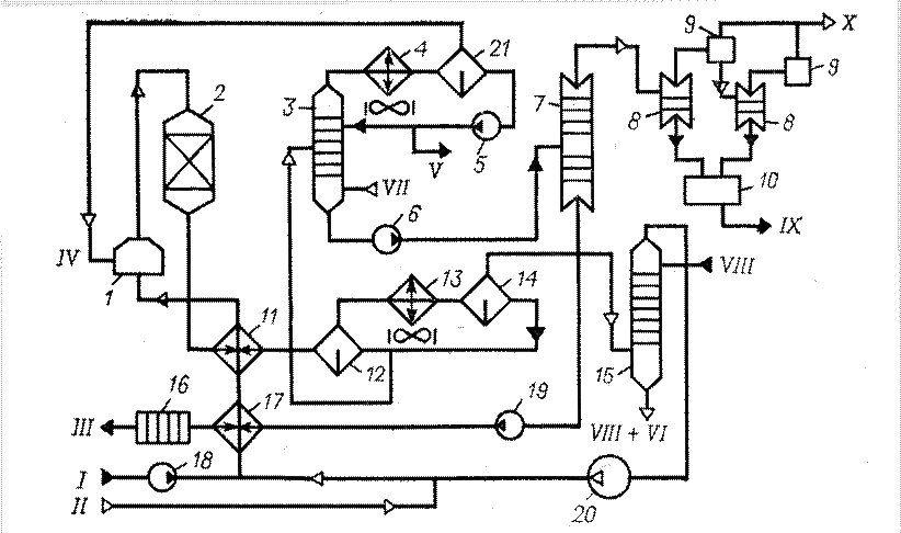 Линии: I – сырье; II – водородсодержащий газ риформинга; III – гидроочищенное масло; IV – углеводородный газ; V – отгон; VI – сероводород; VIII – моноэтаноламин; IX – вода; X – неконденсированные газы.