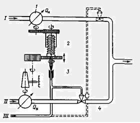 Рисунок. Установка непрерывного смешения, система «Siemens and Halske»: 1 –поршневой счетчик, 2 – дифференциальная винтовая передача, 3 – форсунка для регулирующего воздуха, 4 – регулирующий клапан, I – лимитирующий (эталонный) компонент, II – контрольный компонент, III – воздух для регулирования