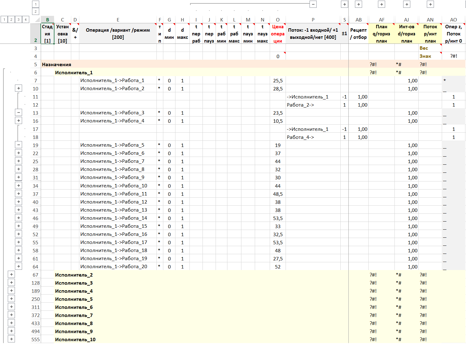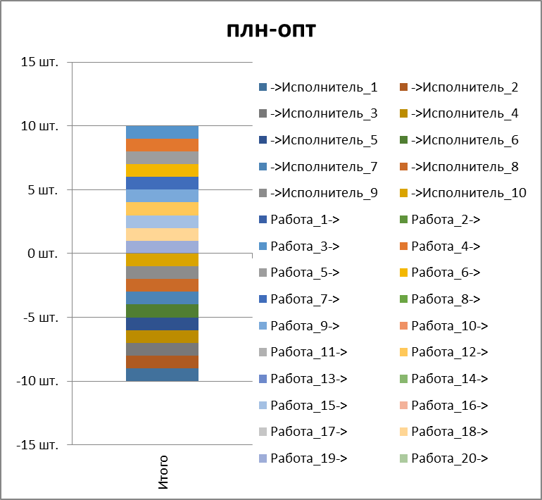 Модель строится «от исполнителей», т.к. число исполнителей (10) меньше числа работ (20).