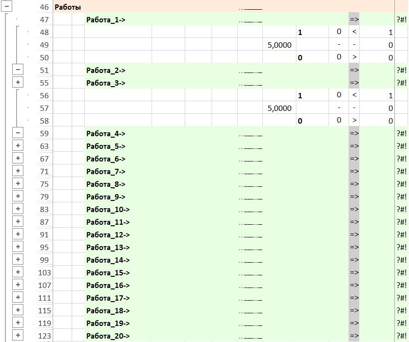 Примечание. Изначально все работы не выполненные (значение 0). В результате невыполненные работы останутся без изменения, а выполненные станут равны 1. Можно задавать обязательно выполняемые работы ограничениями на емкости.