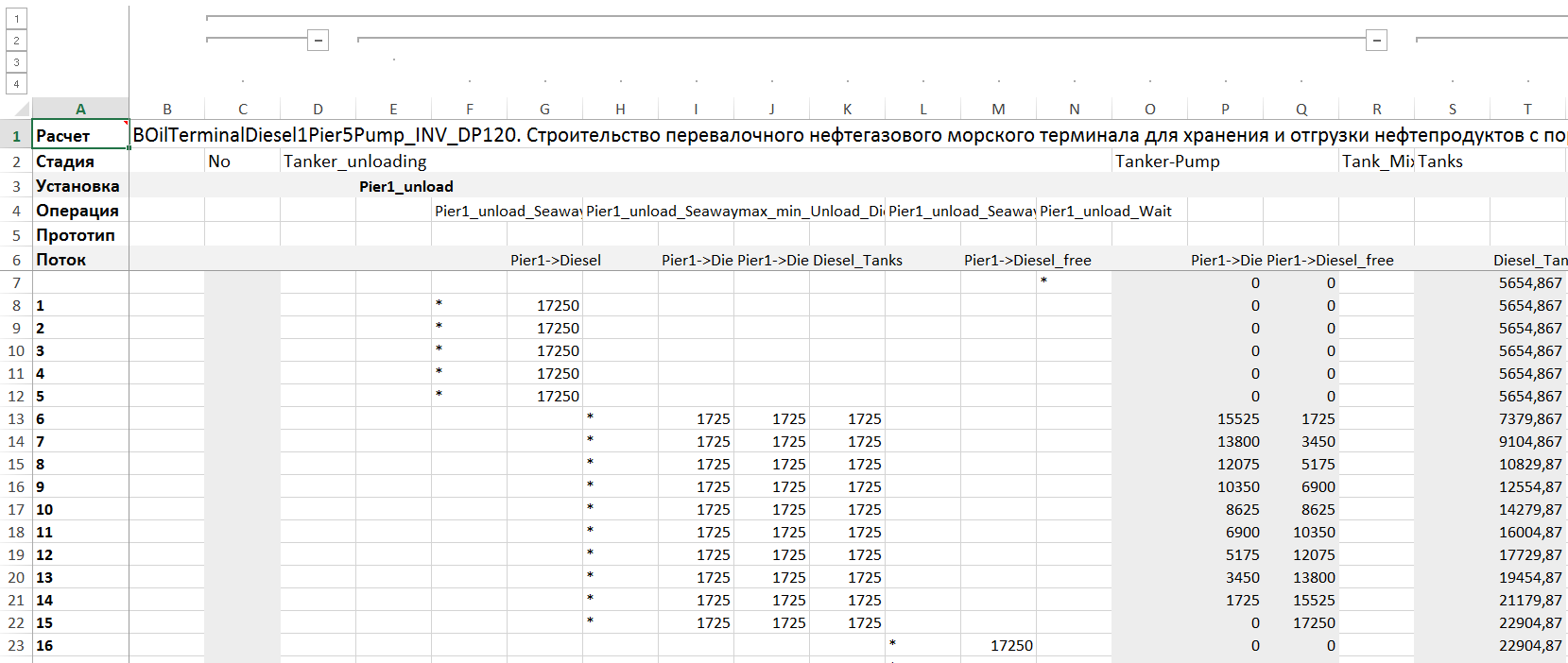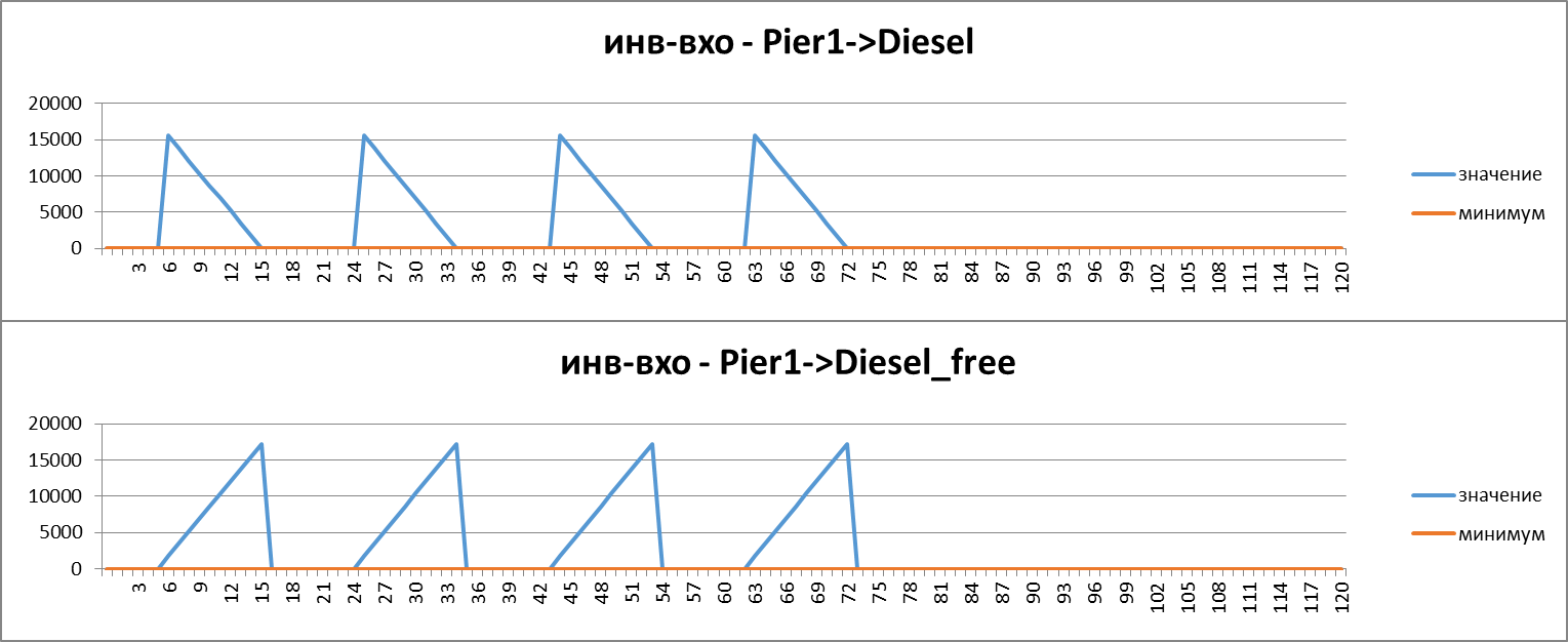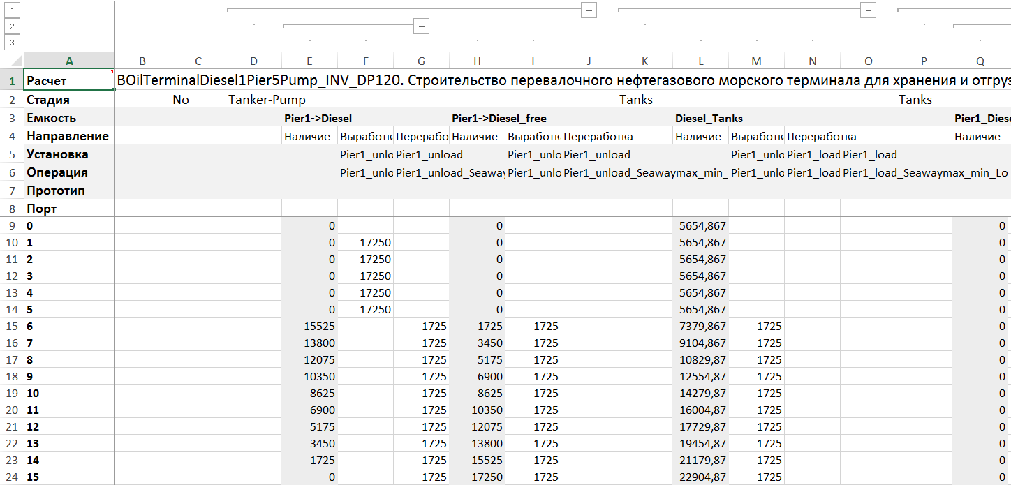 Рисунок. Фрагмент расписания уровня запасов в емкостях