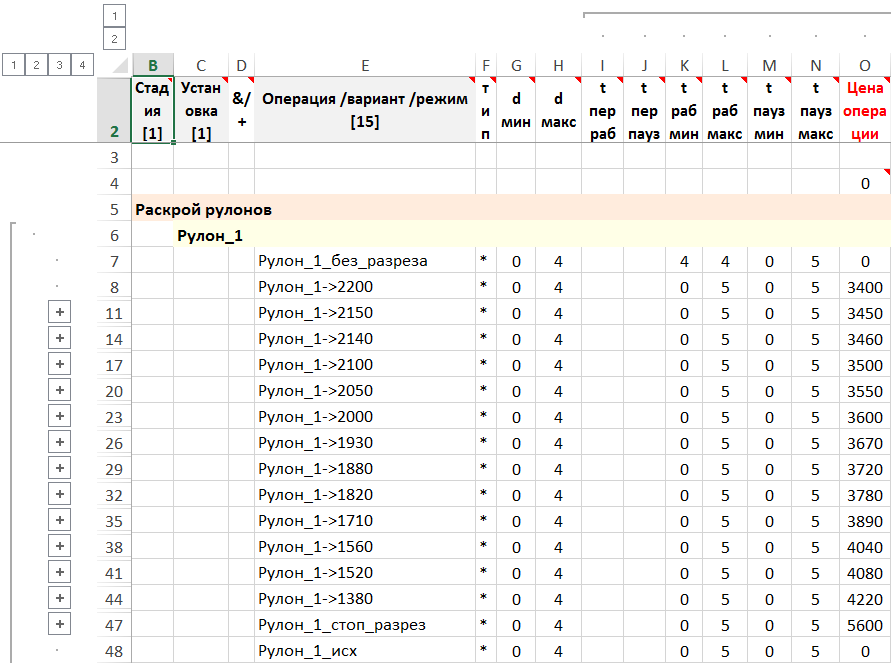 Дополнительная операция «*_без_разреза», не имеющая потоков, используется для отражения случая, когда разрезать рулон не требуется. Эта операция может работать только весь горизонт, переход с нее на другие операции невозможен, как и переходы с разрезов на нее.
