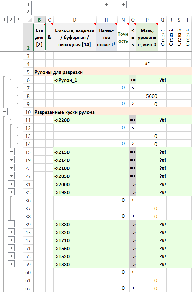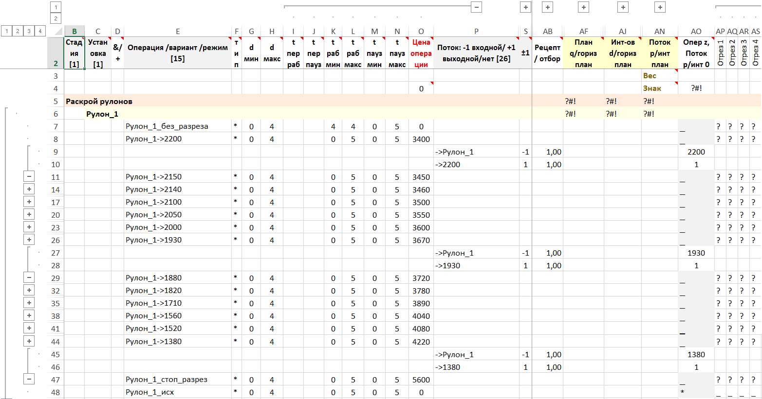 Дополнительная операция «*_исх», не имеющая потоков, используется для отражения начальной ситуации – разрезов нет и не выбрано, необходимо ли разрезать рулон вообще.