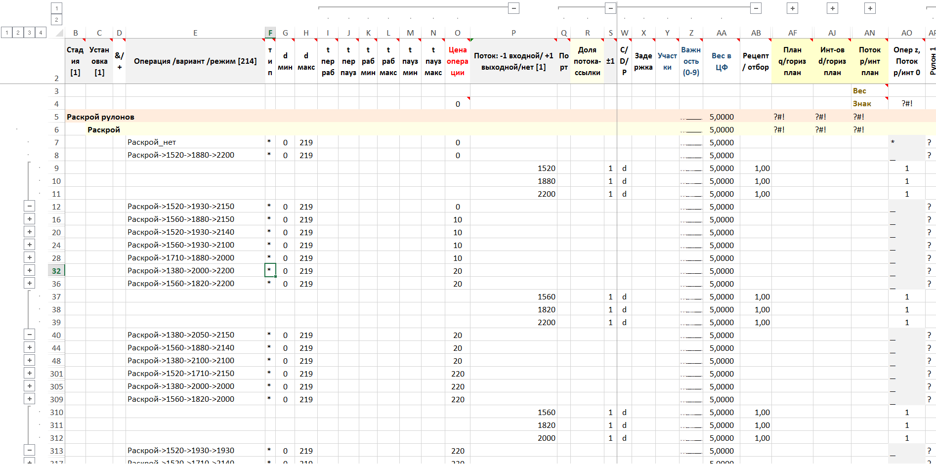 Примечание. Видны цены операций, упорядоченные по возрастанию – более приоритетные раскрои имеют меньше отходов. Каждому раскрою соответствуют куски, на которые разрезается рулон – задаются дискретными потоками операции.
