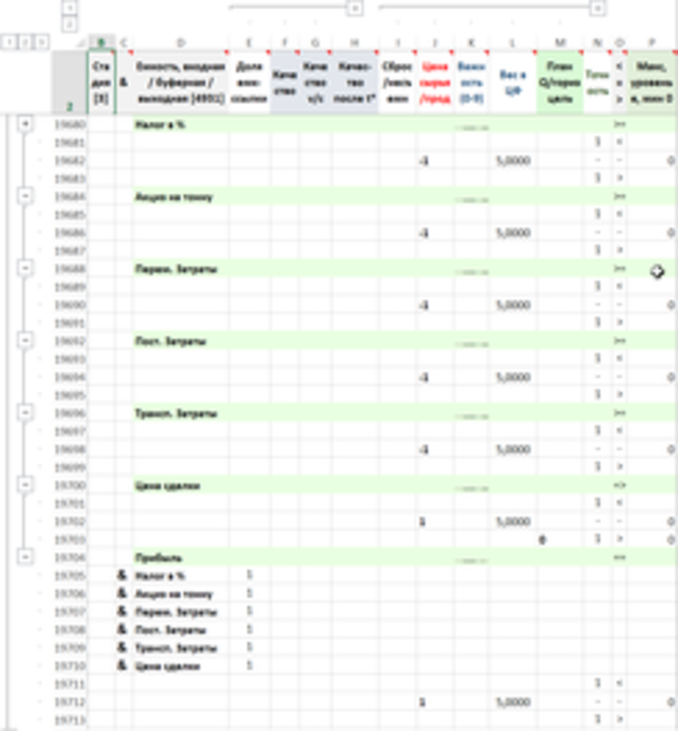 Прибыль вычисляется через композитную емкость «Прибыль», которая вычисляется на основе емкостей «Цена сделки» (положительная), «Налог в %», «Акциз на тонну», «Перем. Затраты», «Пост. Затраты», «Трансп. Затраты» (отрицательные)