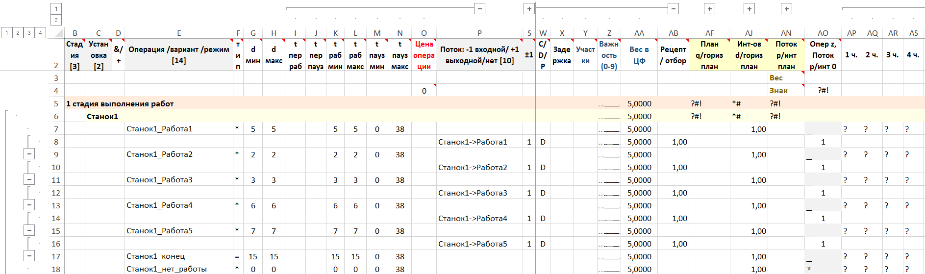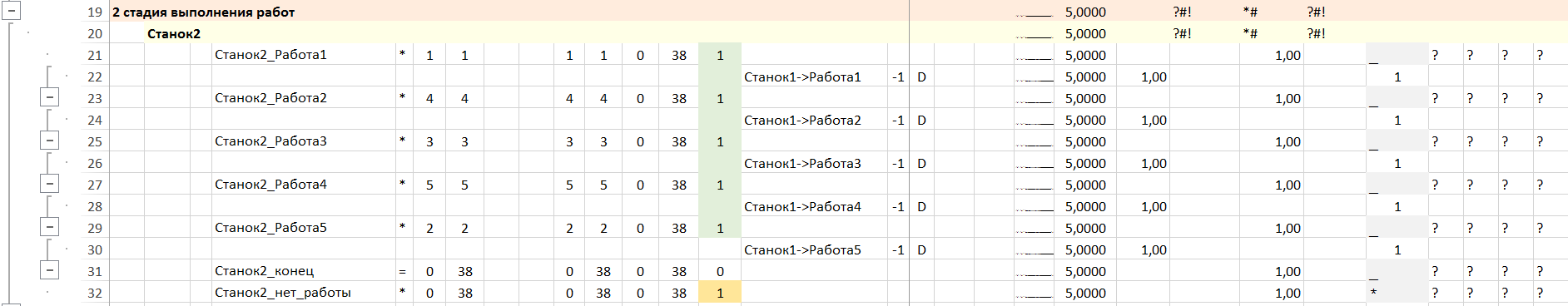 Примечание. Отсутствует ожидание работы у первого станка – операция «Станок1_нет_работы». Время остальных операций вычислимо и задано их суммарное и непрерывное время работы. Дискретный поток величиной 1 гарантирует начало работы второго станка после окончания работы первого. Цены операций не заданы, таким образом общее время выполнения работ на первом станке явно в критерии не учитывается. Оно опосредовано учитывается исходя из последовательности выполнения работ на станках и критерии минимума общего времени выполнения работ на втором станке.