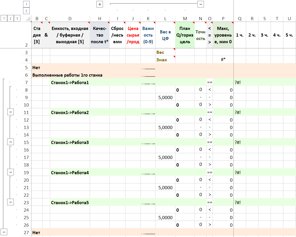 Станок1: Работа1 – 5 часов, Работа2 – 2 часа, Работа3 – 3 часа, Работа4 – 6 часов, Работа5 – 7 часов;