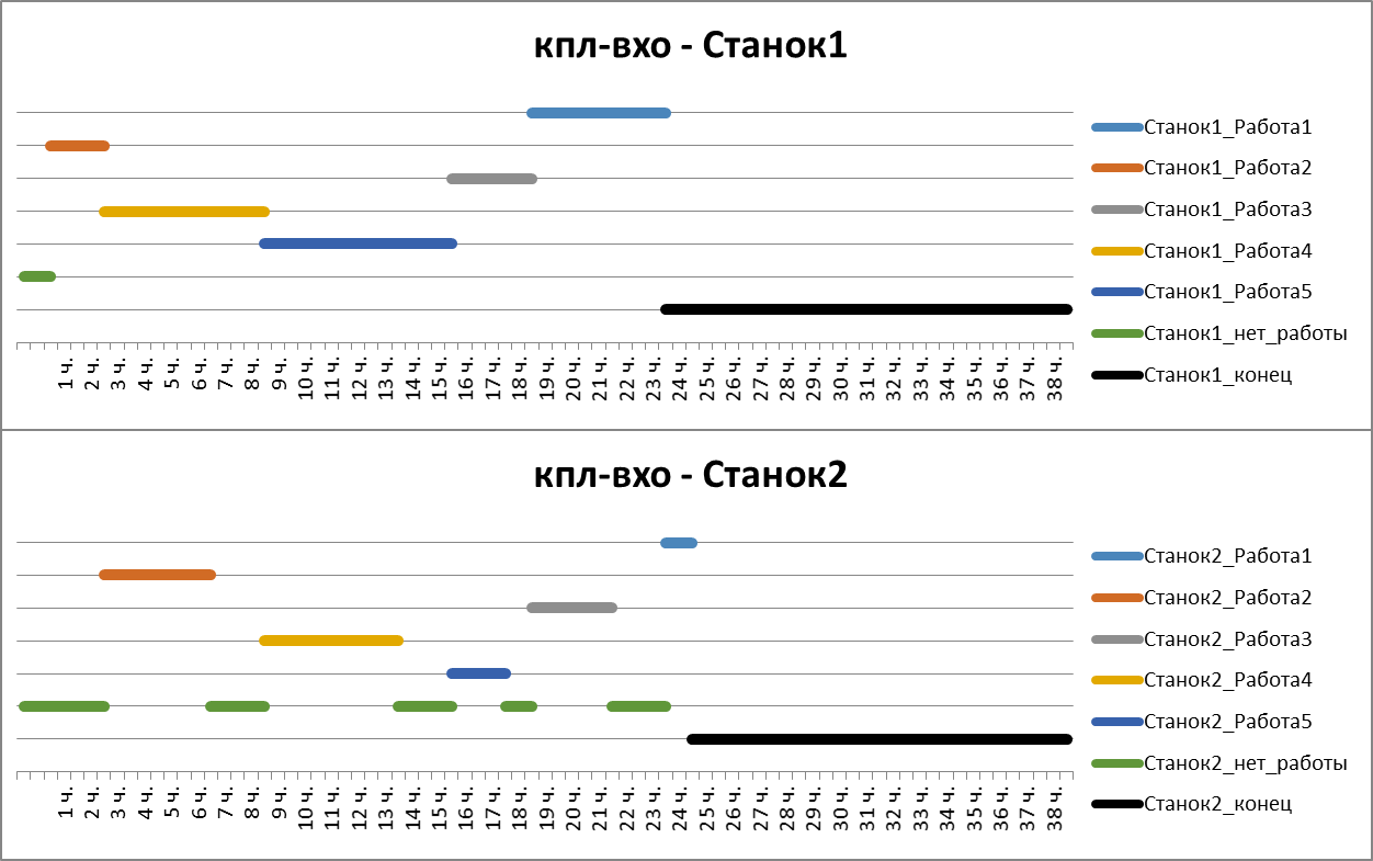 FlowShop2M_SCH_DP38NoJobsWait. Станки, поточная линия, без прерываний, Джонсон. Минимум времени завершения всех работ на двух станках. Календарное планирование. 38 интервалов. Без простоя первого станка и c непрерывной обработкой деталей.