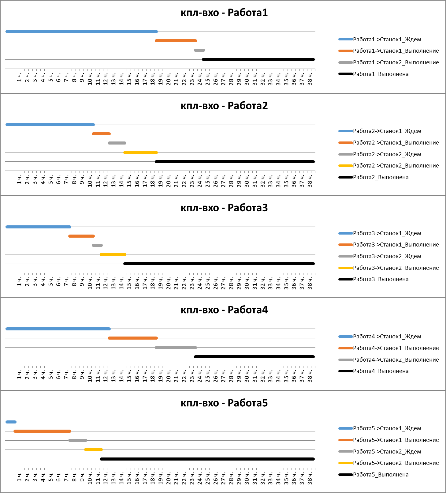 Станок2: Работа1 – 1 час, Работа2 – 4 часа, Работа3 – 3 часа, Работа4 – 5 часов, Работа5 – 2 часа;