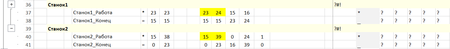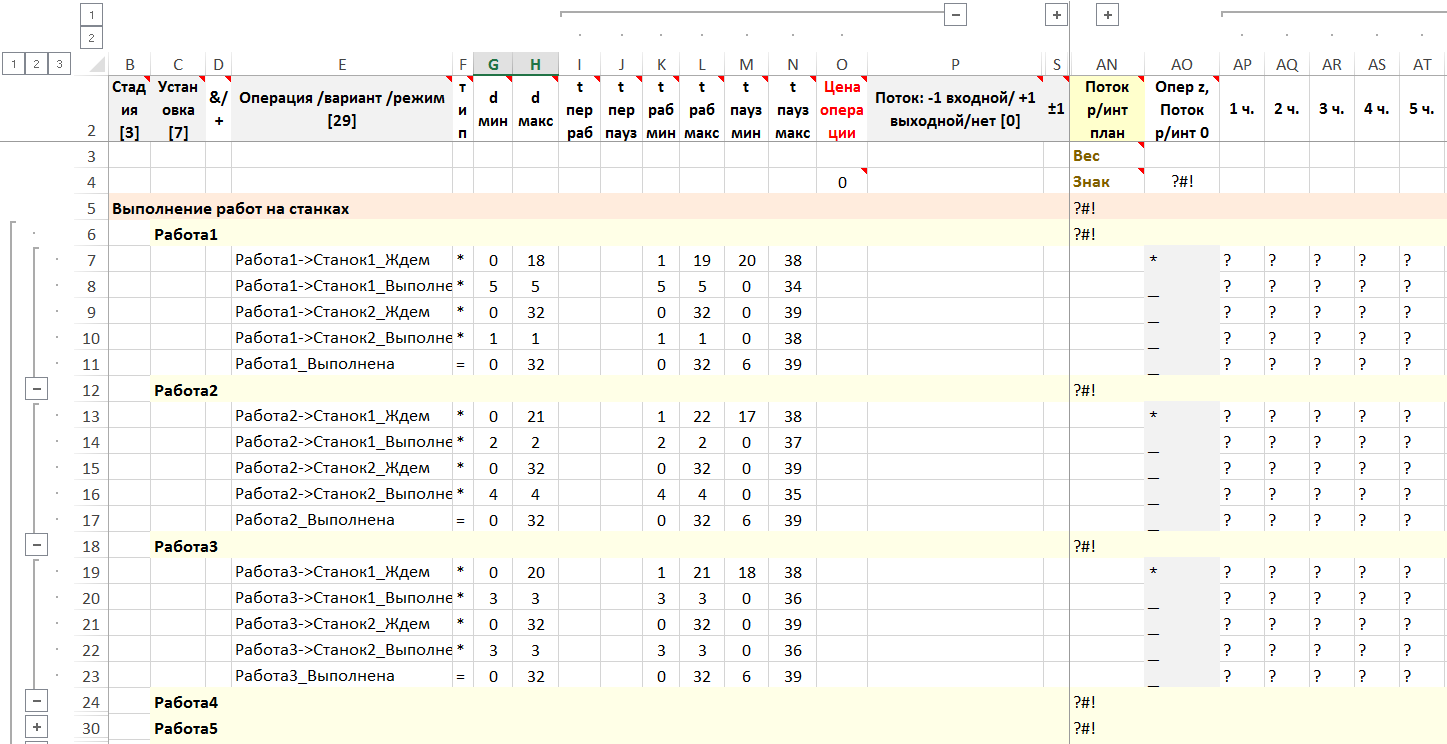 Операциями установки является использование станка – ожидание работы или ее выполнения; и простой станка – окончание выполнения всех работ на станке. Операции установок жестко связаны с операциями установок первого типа ограничениями на одновременную работу и паузу в интервалах времени.