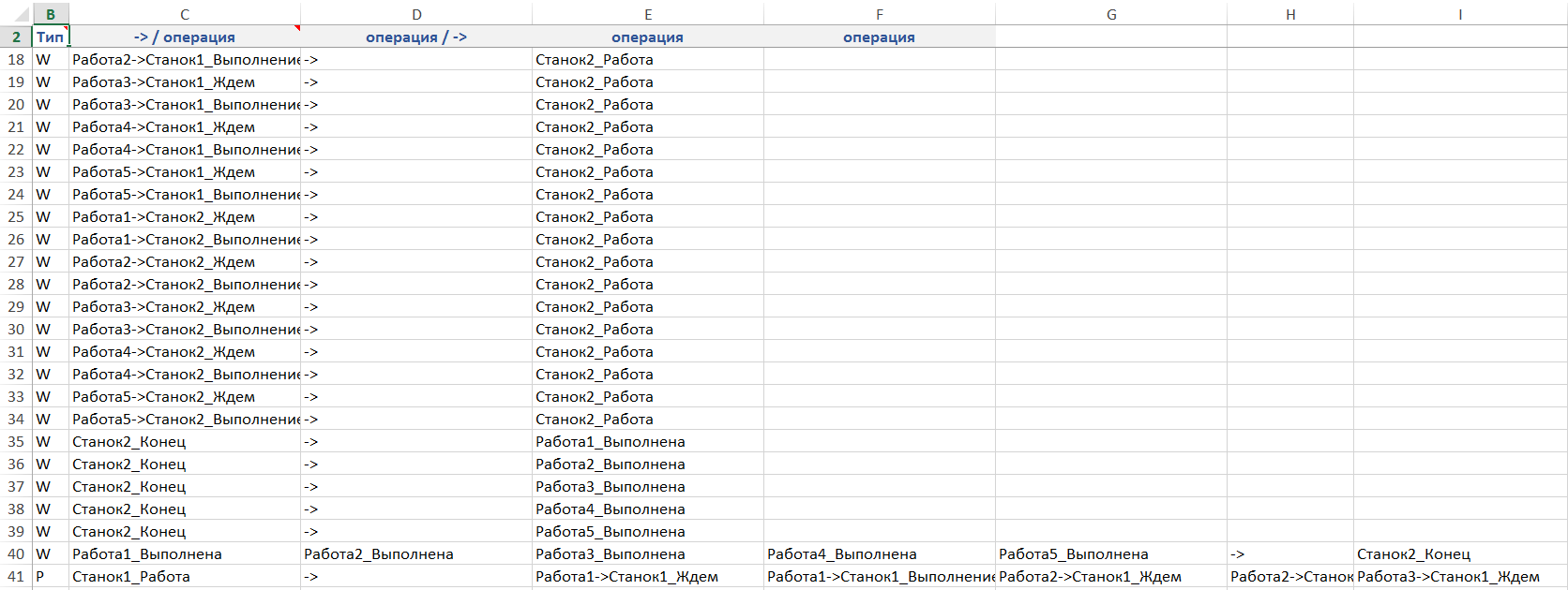 Операциями установок первого типа является стадии выполнения работ: ожидание выполнения на одном из станков, выполнение на одном из станков, окончание выполнения. Потоки операций отсутствуют.