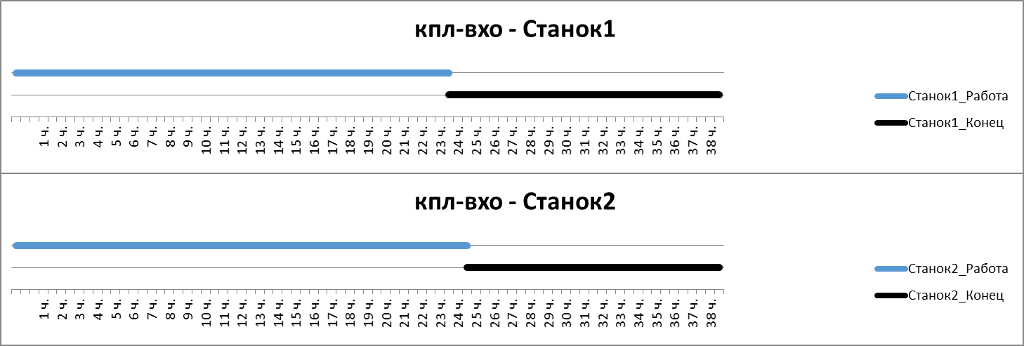 • Время ожидания выполнения работ для первого станка равно 0. Первый станок выполняет работы без ожидания, для него всегда есть работы для выполнения.