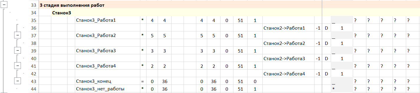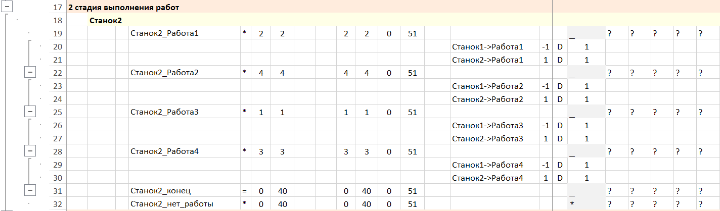 Требование последовательного выполнения работ задается дискретными потоками величиной 1 для операций выполнения работы на станке. Входящий поток – работа должна быть выполнена на предыдущем станке. Выходящий поток – после выполнения работы она доступна для выполнения на следующем станке.