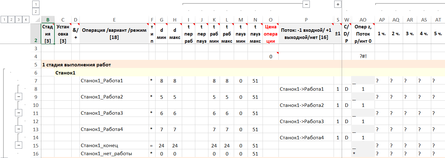 Примечание. Отсутствует ожидание работы у первого станка – операция «Станок1_нет_работы». Время остальных операций вычислимо и задано их суммарное и непрерывное время работы. Дискретный поток величиной 1 гарантирует начало работы второго станка после окончания работы первого. Цены операций не заданы, таким образом общее время выполнения работ на первом станке явно в критерии не учитывается. Оно опосредовано учитывается исходя из последовательности выполнения работ на станках и критерии минимума общего времени выполнения работ на втором станке.