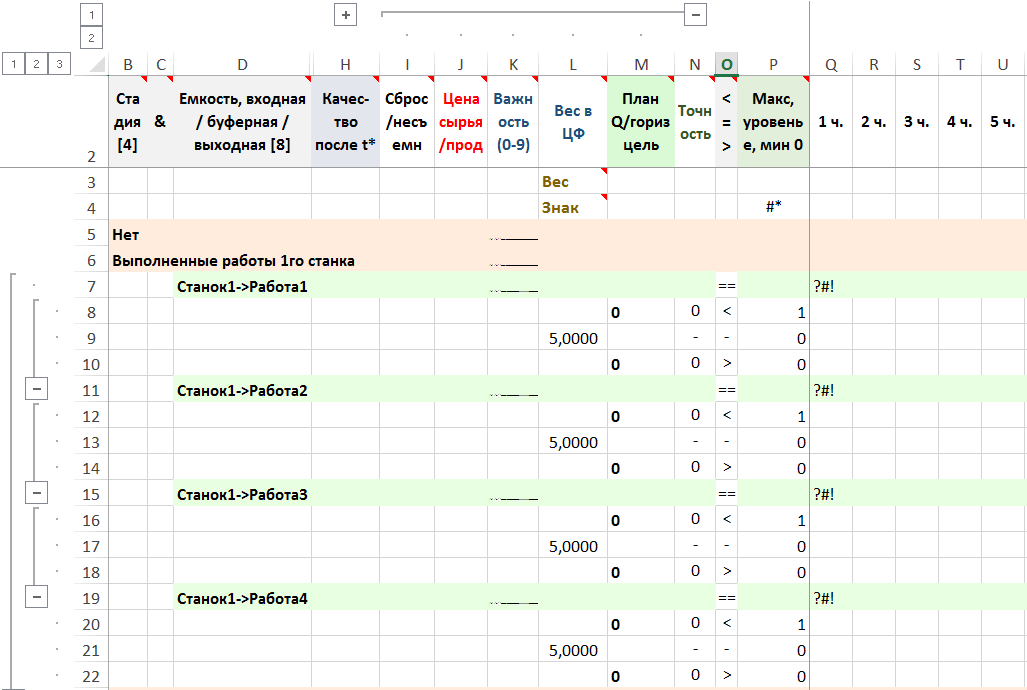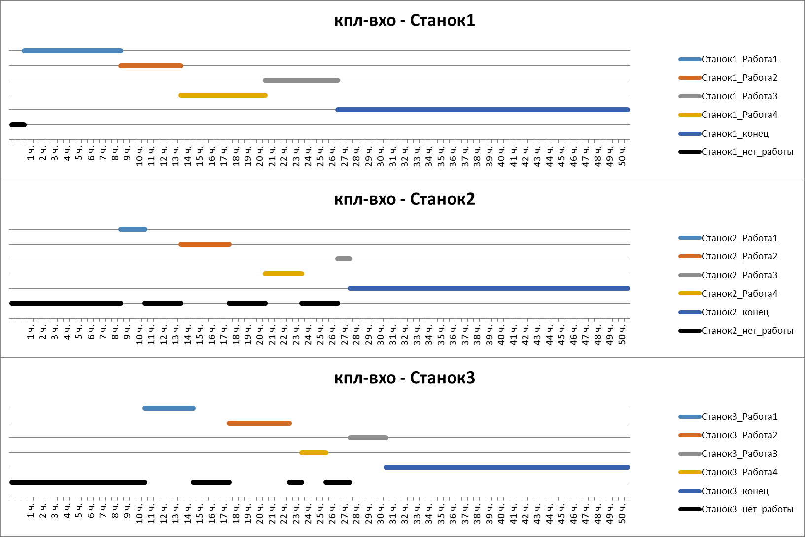 Станок3: Работа1 – 4 часа, Работа2 – 5 часов, Работа3 – 3 часа, Работа4 – 2 часа;