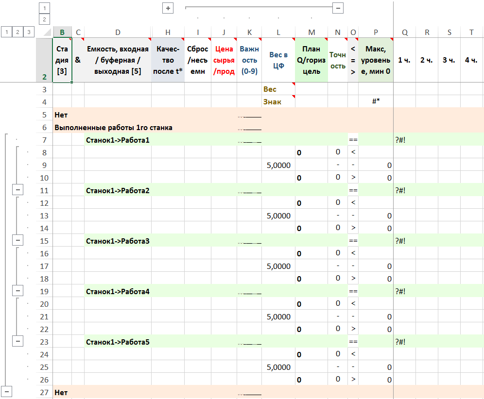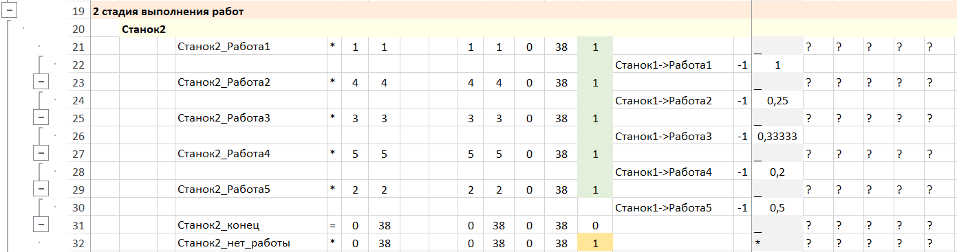 Примечание. Отсутствует ожидание работы у первого станка – операция «Станок1_нет_работы». Время остальных операций вычислимо и задано их суммарное время работы. Величина поток – доля равномерного выполнения работы. Цены операций не заданы, таким образом общее время выполнения работ на первом станке явно в критерии не учитывается. Оно опосредовано учитывается исходя из последовательности выполнения работ на станках и критерии минимума общего времени выполнения работ на втором станке.