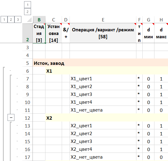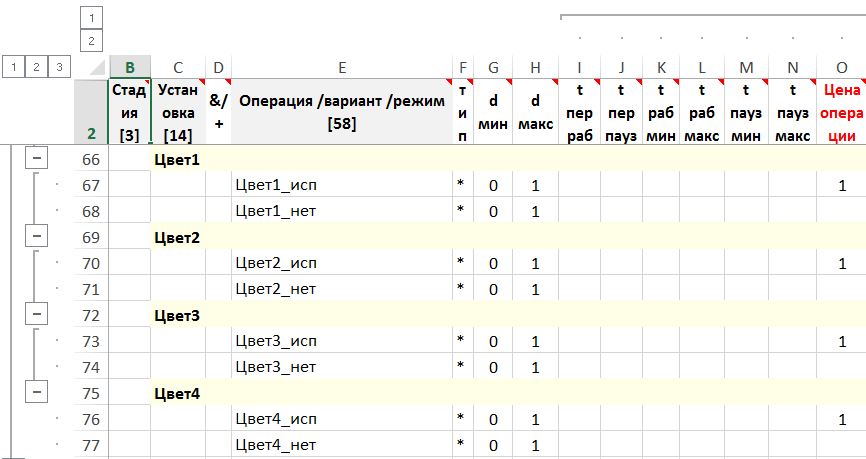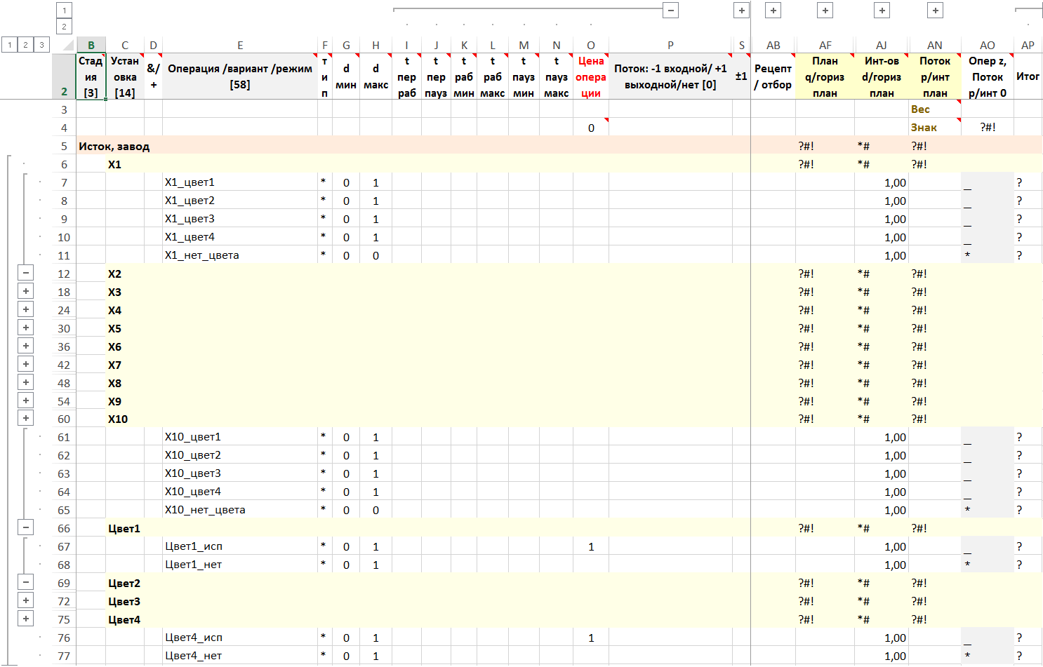 Стадий 1, Установок 14, Операций 58, Емкостей 0, Интервалов 1, Переменных 58.