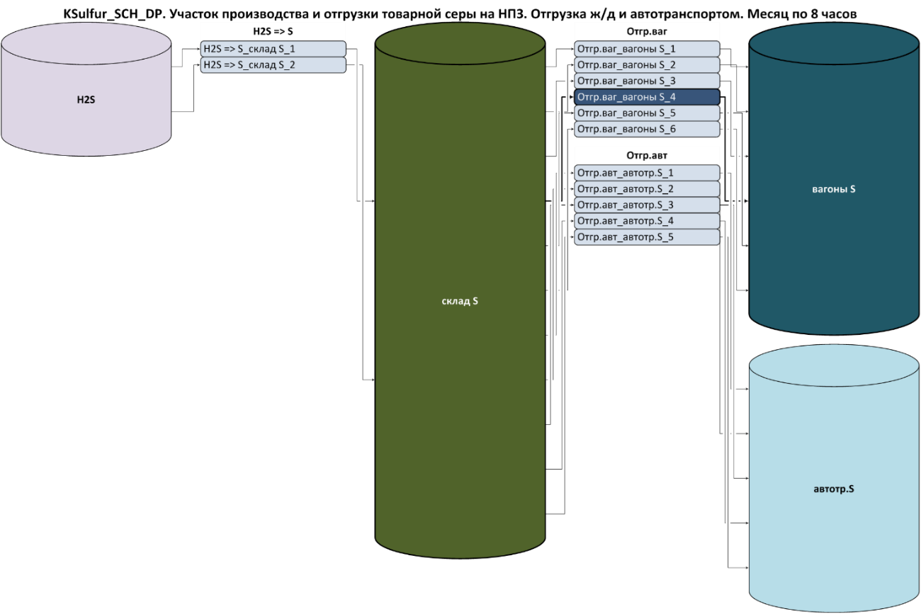 Стадию отгрузки товарной серы, состоящей из двух установок, описывающих способы отгрузки комовой серы заказчикам: установка «Отгр.ваг» описывает отгрузку комовой серы со склада серы «склад S» в железнодорожные вагоны, объемы отгрузки которой описывается емкостью «вагоны S» нарастающим итогом; установка «Отгр.авт» описывает отгрузку комовой серы со склада серы «склад S» в автотранспорт, объемы отгрузки которой описывается емкостью «автотр.S» нарастающим итогом.