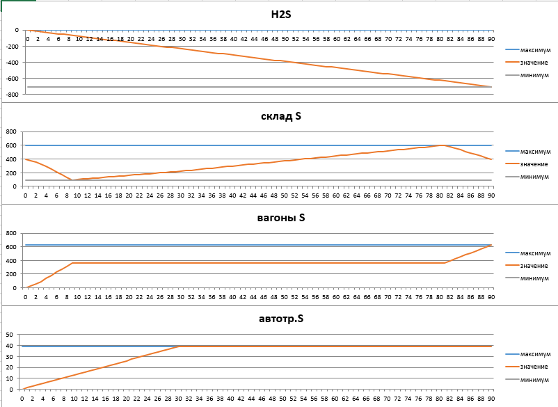 Определяется посуточный или посменный график (расписание) отправки серы в вагонах и в автомобилях (раздельно), а также объемы отправленной серы в вагонах и в автомобилях нарастающим итогом в зависимости от времени, динамику запасов серы на складе в зависимости от времени и динамику потребления сероводорода нарастающим итогом.
