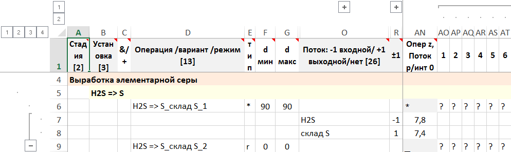 Стадию выработки элементарной серы, состоящей из установки «H2S => S», описывающей выработку элементарной серы из сероводорода, которая перерабатывает сероводород, поступающий из трубопровода, описываемого емкостью H2S в товарную комовую серу, поступающую на склад серы для отгрузки, описываемой емкостью «склад S».