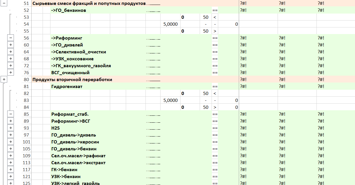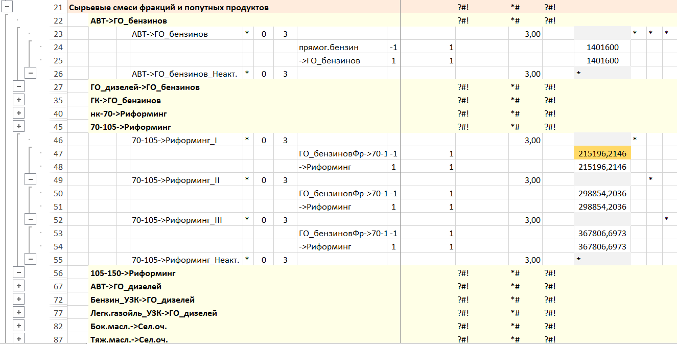 Смеси сырья для установок и компоненты топлив моделируются отдельными установками для каждого компонента смеси, обеспечивая независимость смешения и отсутствие жесткой рецептуры. Содержат операции — «активность» компонента в смеси соответствующего одному из вариантов смеси для этапов строительства НПЗ и «неактивность» компонента в смеси.