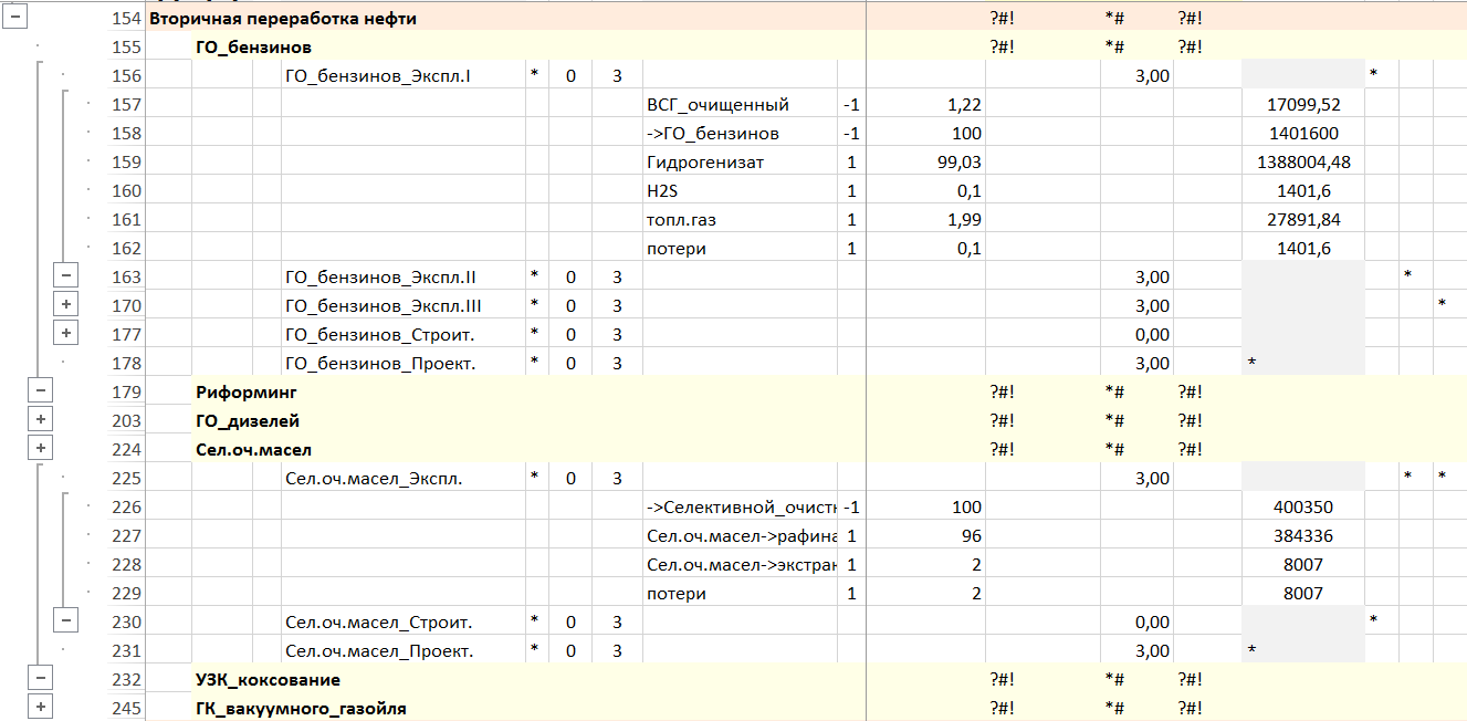 Основные установки НПЗ моделируются установками, имеющими операции «Ожид» — ожидание строительства установки (проектирование), «Строит.» — строительство установки с финансовым потоком затрат на строительство установки и «Экспл.N» — один из вариантов эксплуатации установки, отличающихся объемом переработки и составом сырья. Варианты эксплуатации установок отражают варианты эксплуатации установок на трех этапах.