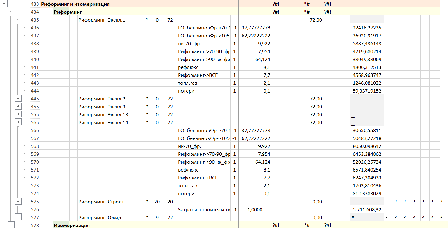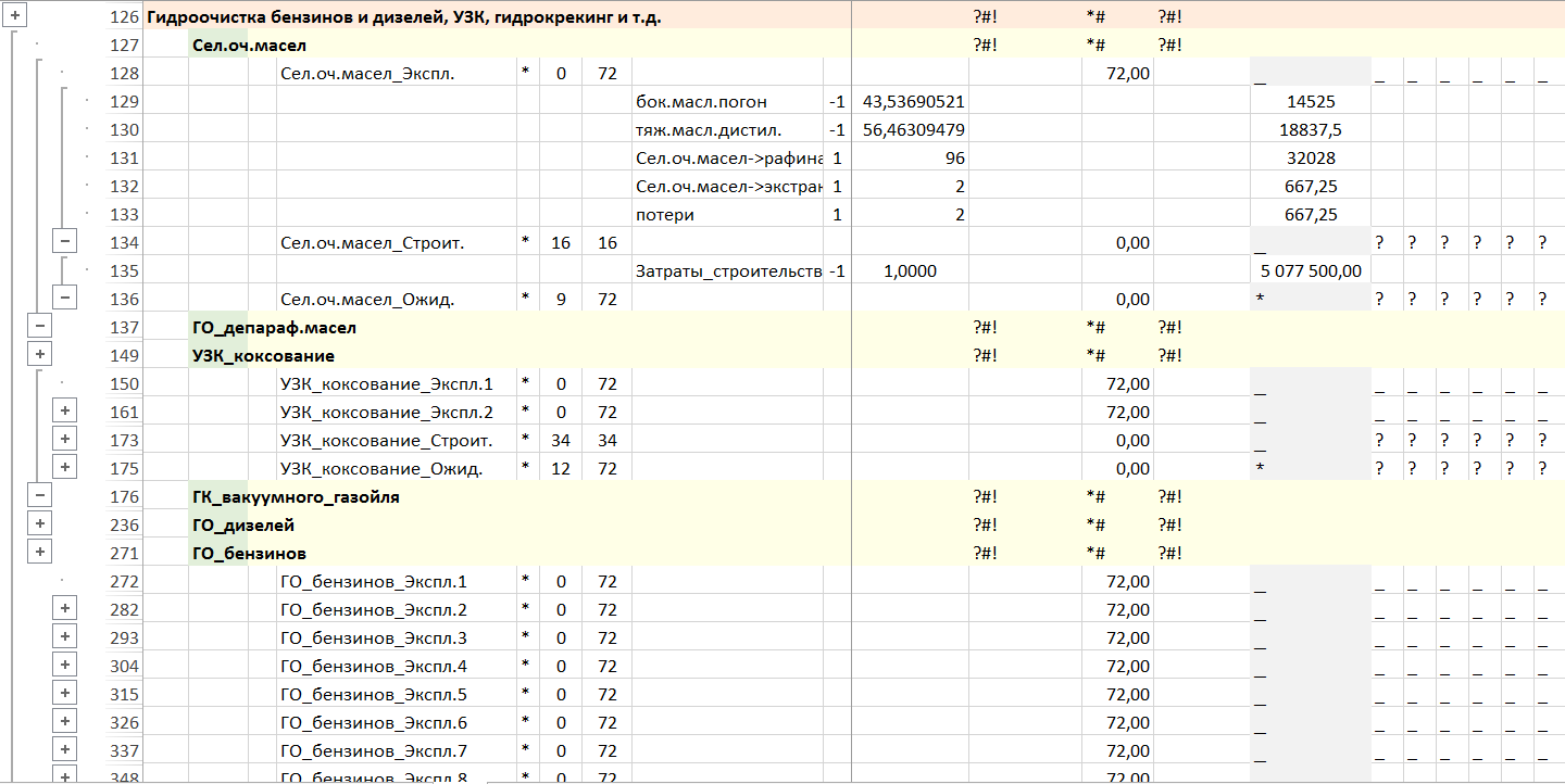 Основные установки НПЗ моделируются установками, имеющими операции «Ожид» — ожидание строительства установки (проектирование), «Строит.» — строительство установки с финансовым потоком затрат на строительство установки и «Экспл.N» — один из вариантов эксплуатации установки, отличающихся объемом переработки и составом сырья. Варианты эксплуатации установок отражают все возможные комбинации ввода в эксплуатации установок.