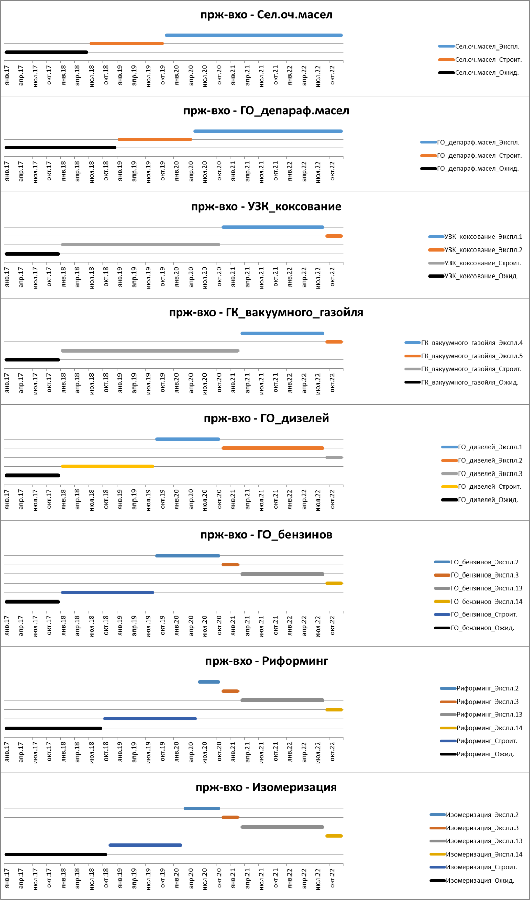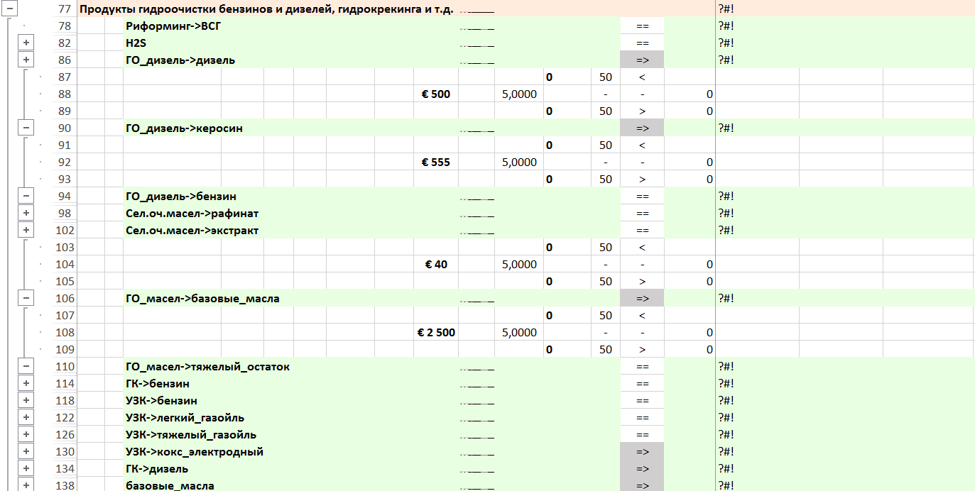 Основные установки НПЗ моделируются установками, имеющими операции «Ожид» — ожидание строительства установки (проектирование), «Строит.» — строительство установки с финансовым потоком затрат на строительство установки и «Экспл.N» — один из вариантов эксплуатации установки, отличающихся объемом переработки и составом сырья. Варианты эксплуатации установок отражают все возможные комбинации ввода в эксплуатации установок.