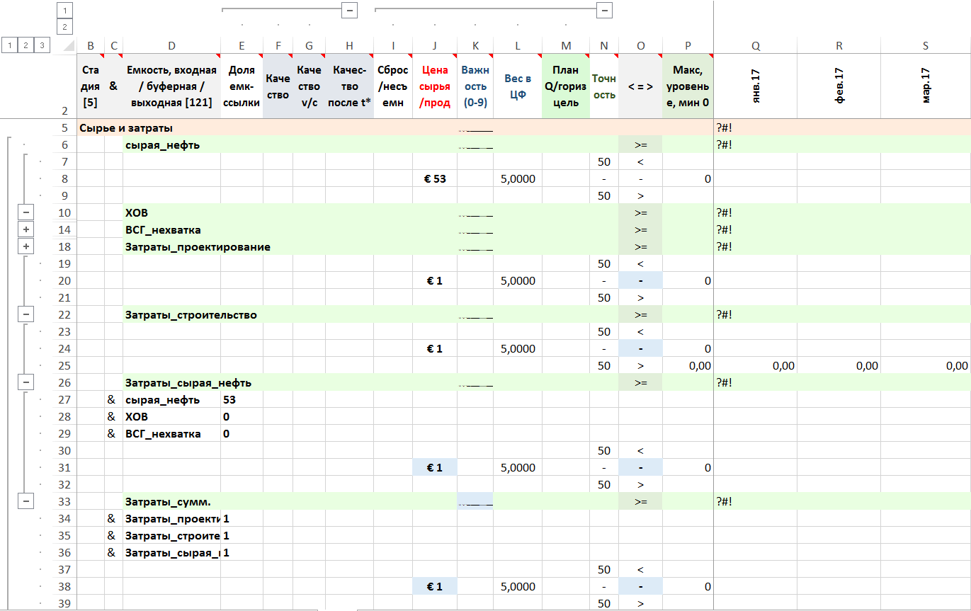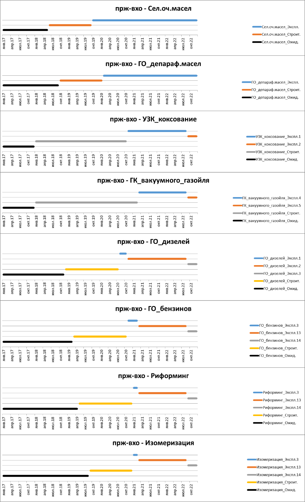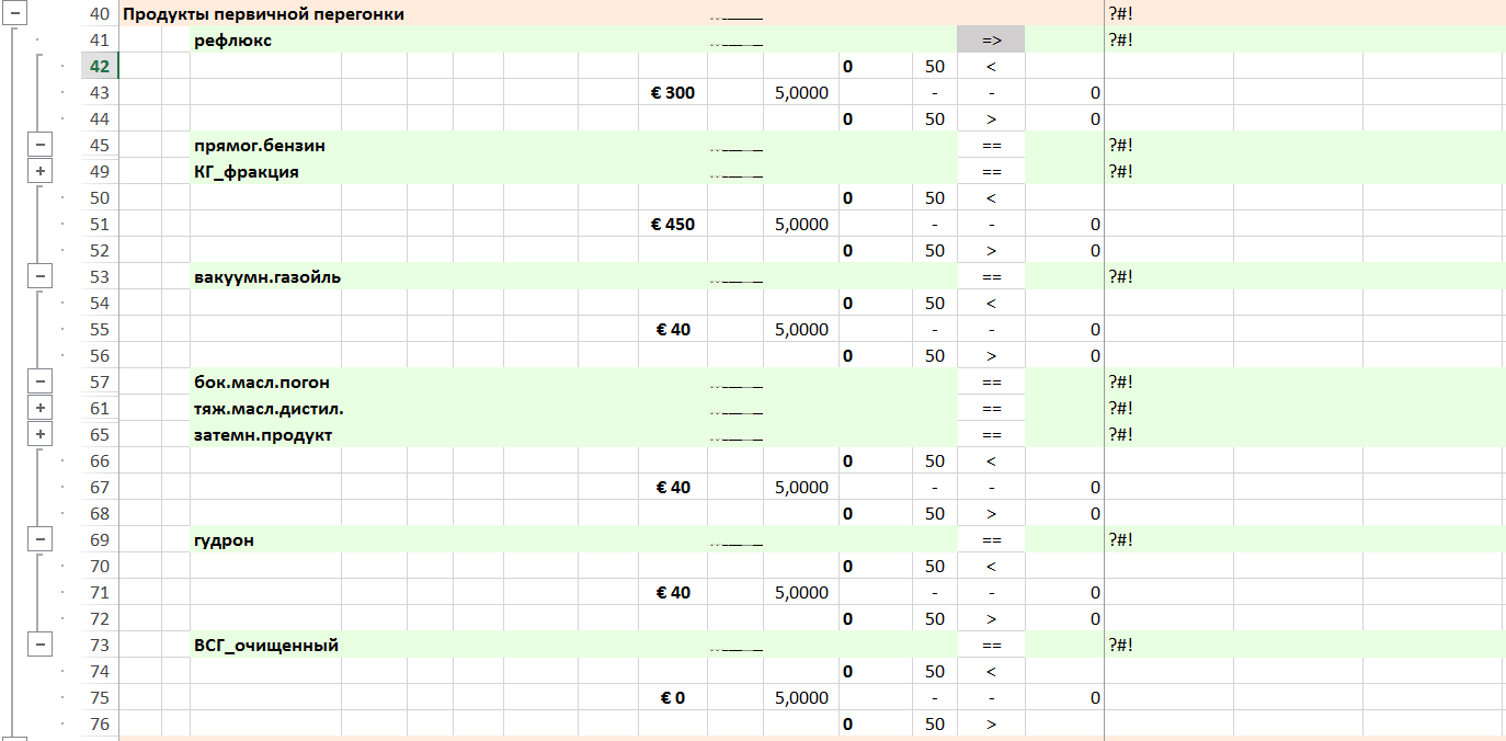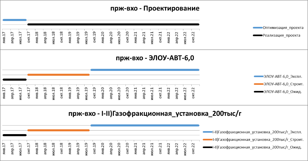 Основные установки НПЗ моделируются установками, имеющими операции «Ожид» — ожидание строительства установки (проектирование), «Строит.» — строительство установки с финансовым потоком затрат на строительство установки и «Экспл.N» — один из вариантов эксплуатации установки, отличающихся объемом переработки и составом сырья. Варианты эксплуатации установок отражают все возможные комбинации ввода в эксплуатации установок.