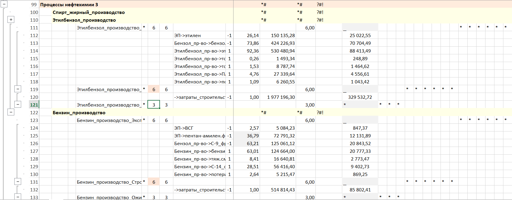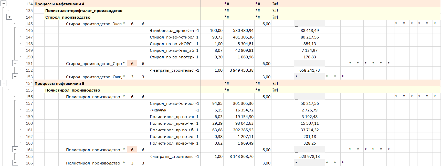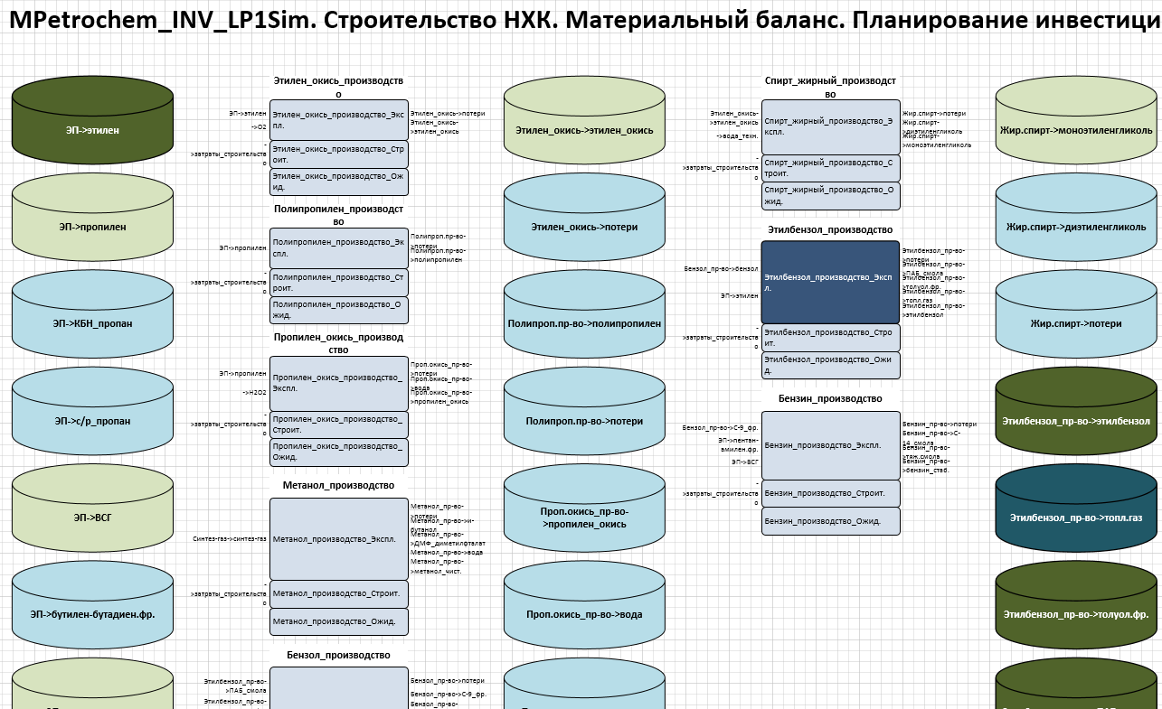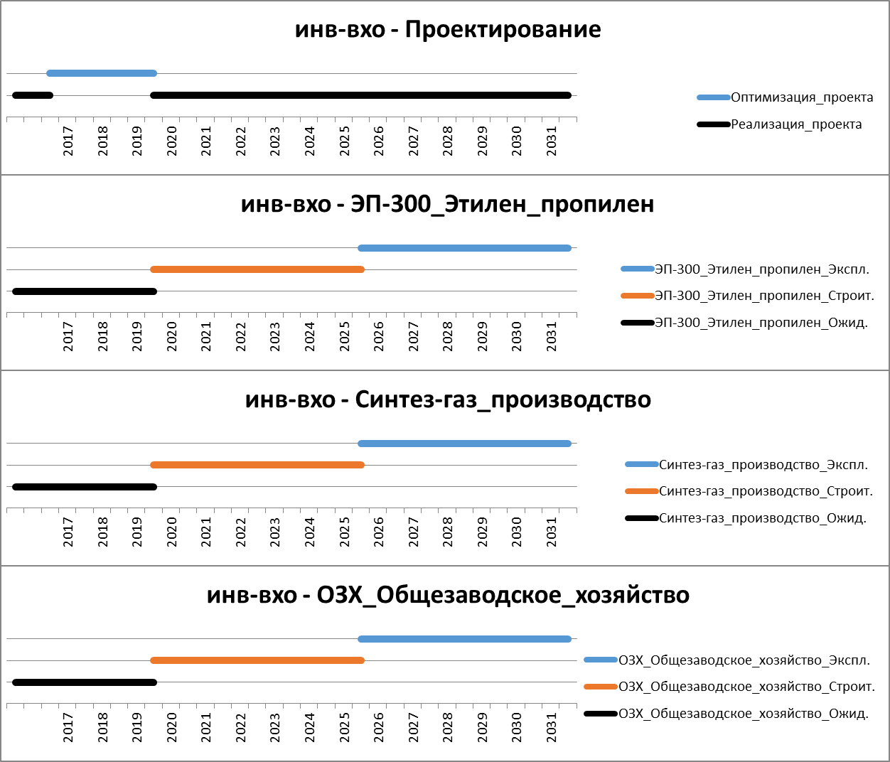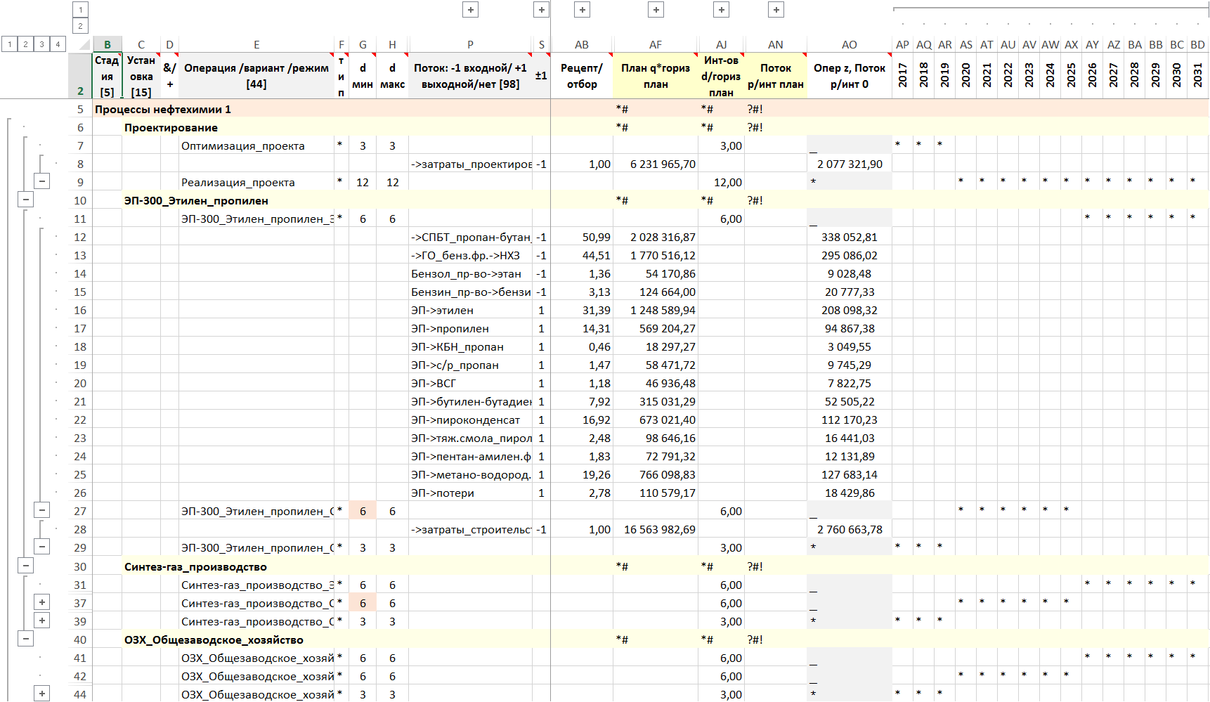 Основные установки НХК моделируются установками, имеющими операции «Ожид» — ожидание строительства установки (проектирование), «Строит.» — строительство установки с финансовым потоком затрат на строительство установки и «Экспл.N» — один из вариантов эксплуатации установки, отличающихся объемом переработки и составом сырья. Варианты эксплуатации установок отражают все возможные комбинации ввода в эксплуатации установок.