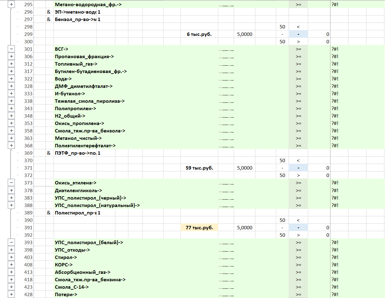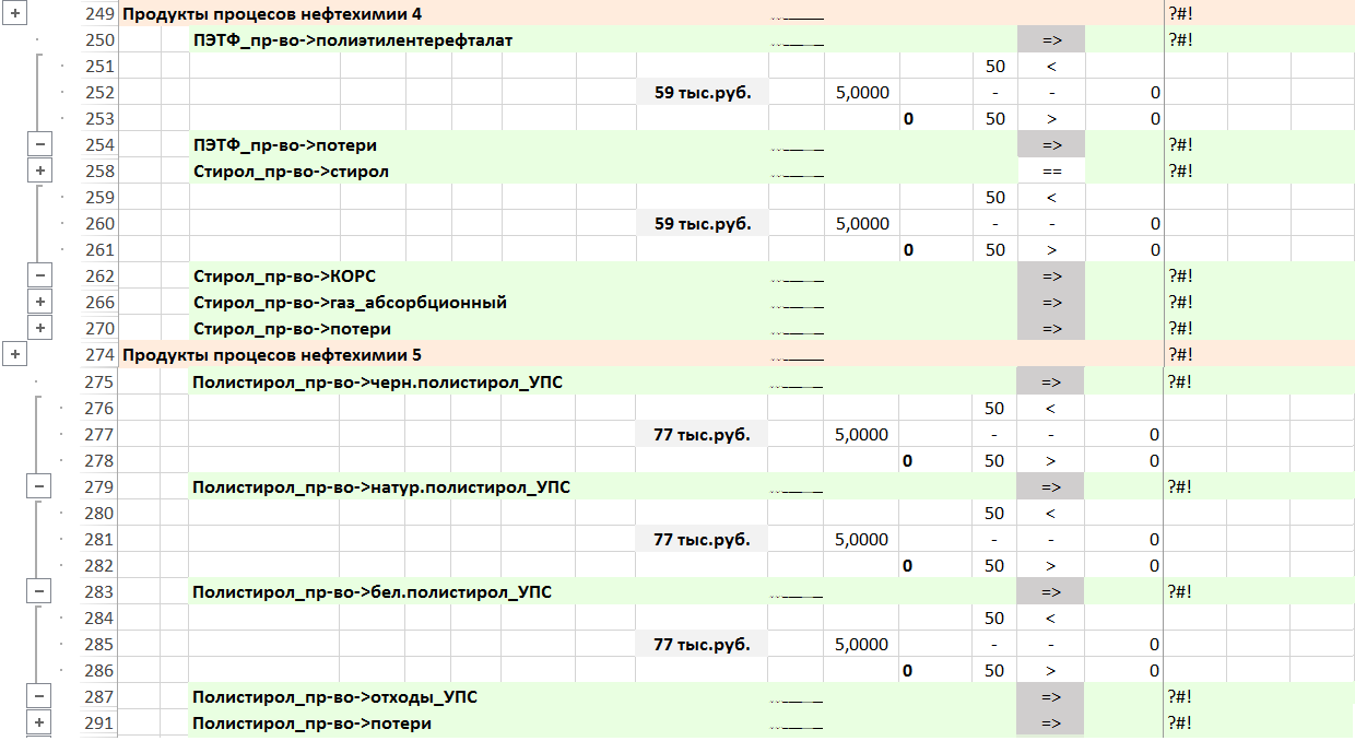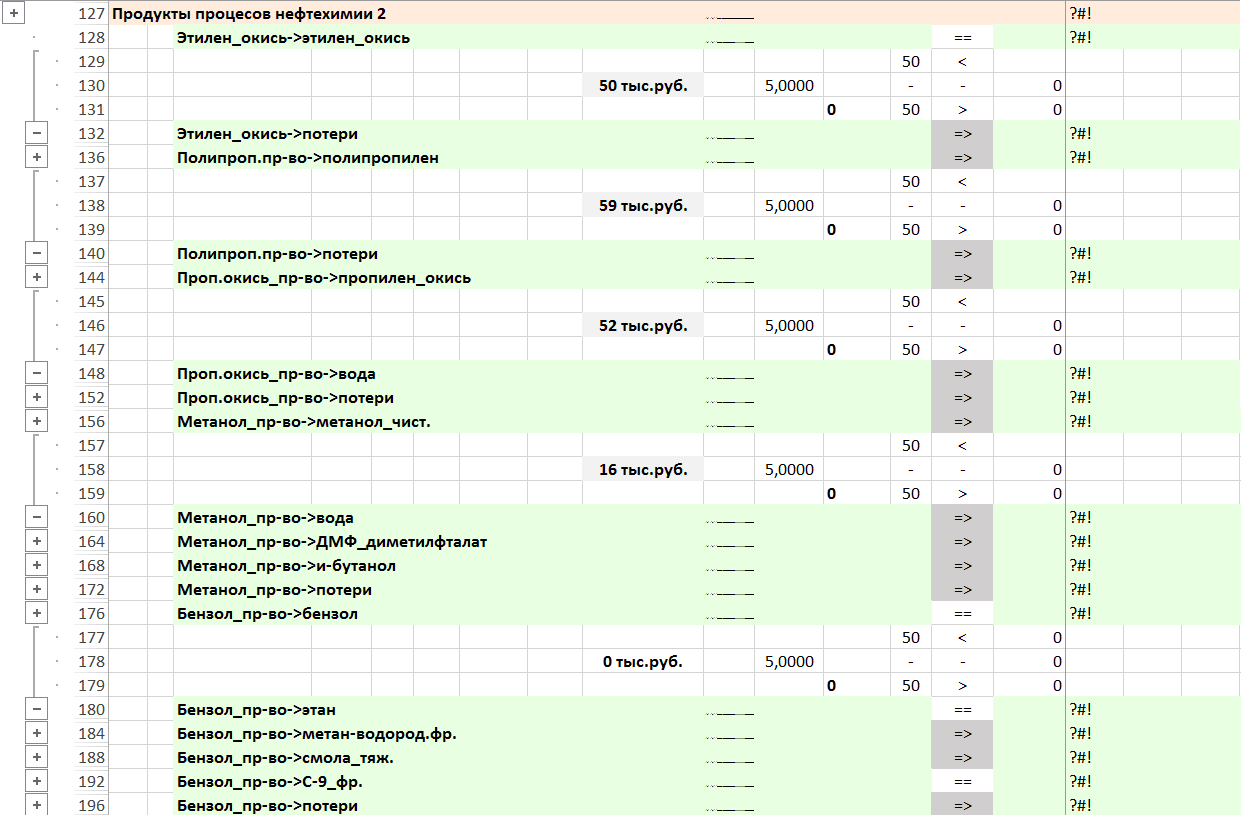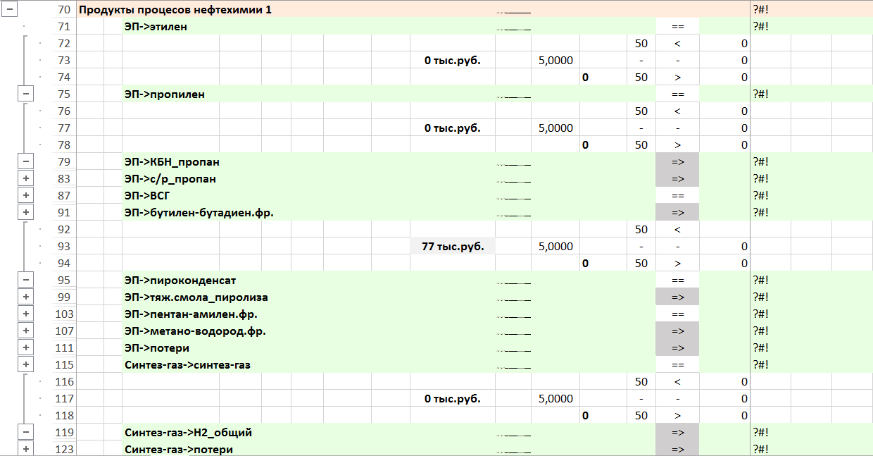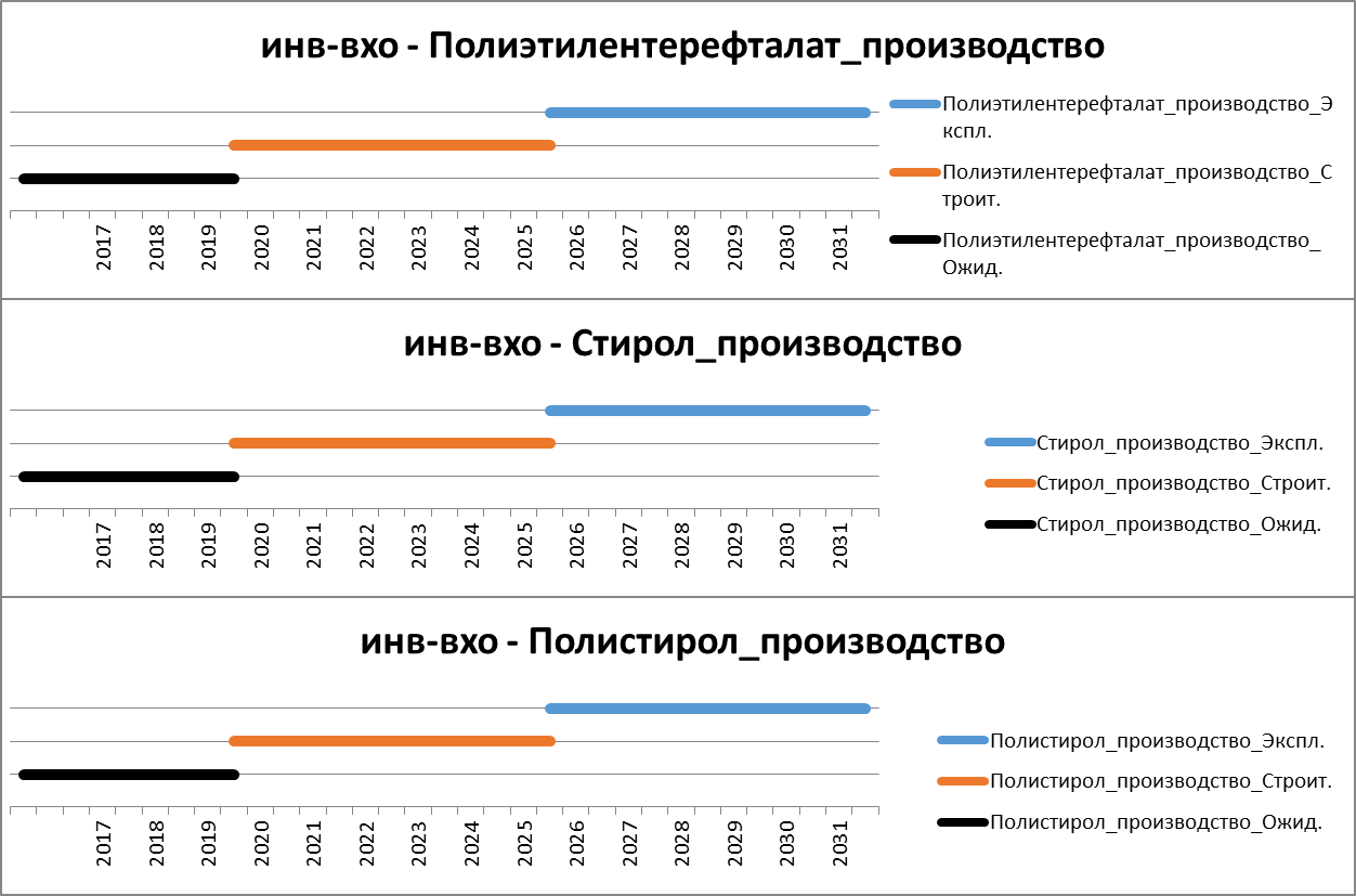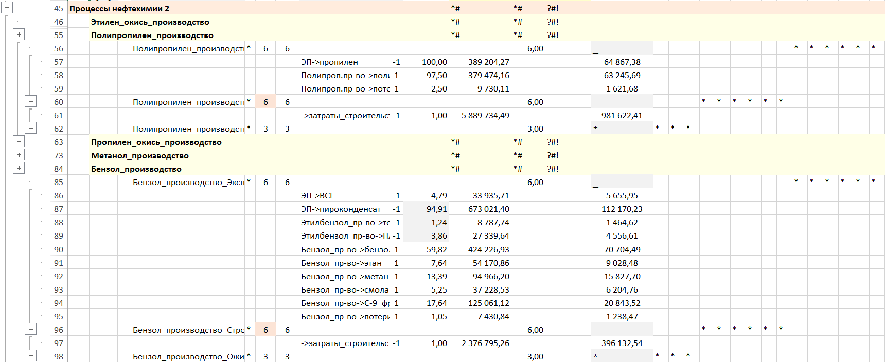 Основные установки НХК моделируются установками, имеющими операции «Ожид» — ожидание строительства установки (проектирование), «Строит.» — строительство установки с финансовым потоком затрат на строительство установки и «Экспл.N» — один из вариантов эксплуатации установки, отличающихся объемом переработки и составом сырья. Варианты эксплуатации установок отражают все возможные комбинации ввода в эксплуатации установок.
