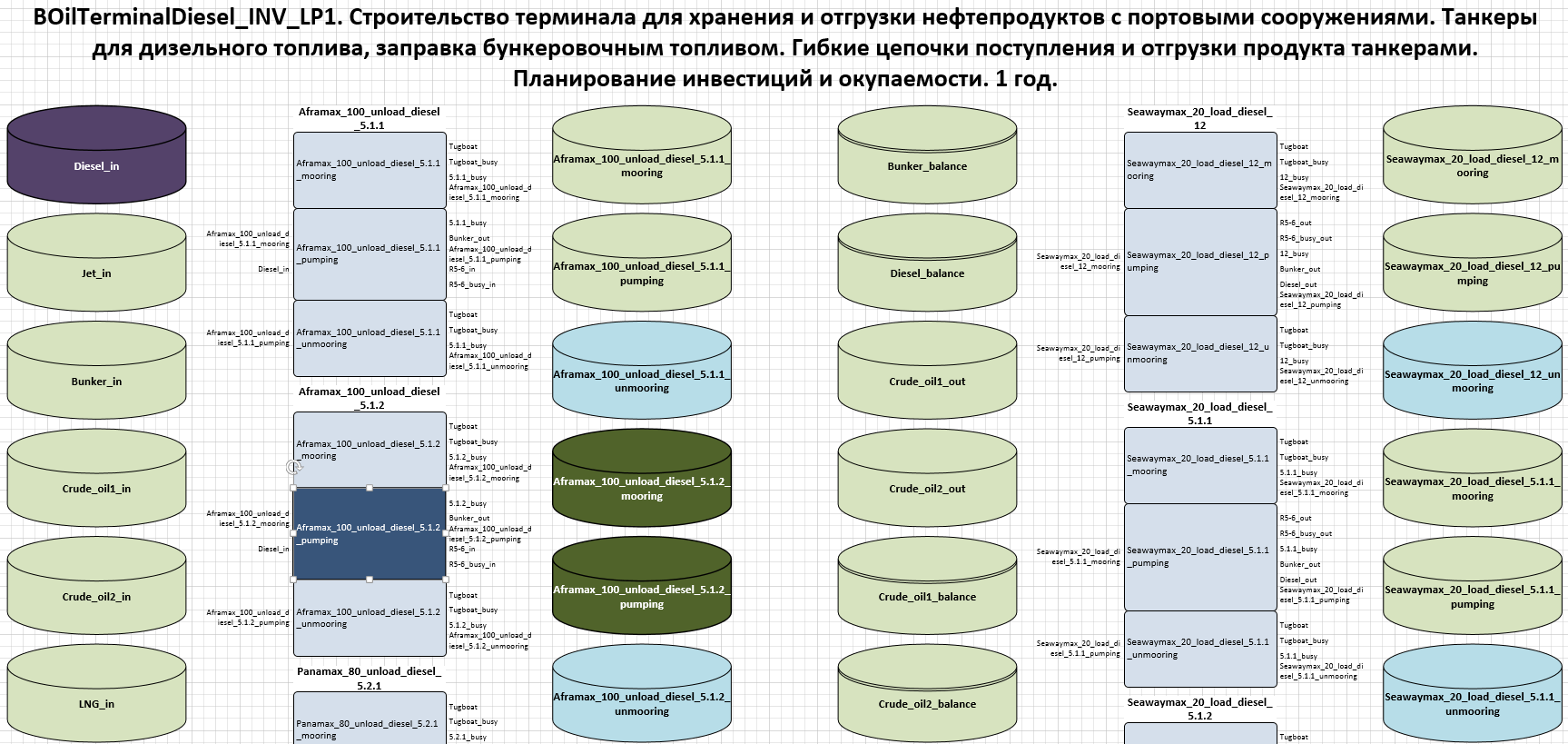 • Налива продукта, которая учитывает время занятости причала, на котором стоит танкер, объем наливаемого в танкер продукта, затраченное на налив время, объем и время, затраченное для перекачки продукта из резервуарных парков, а также объем заправляемого топлива в танкер.