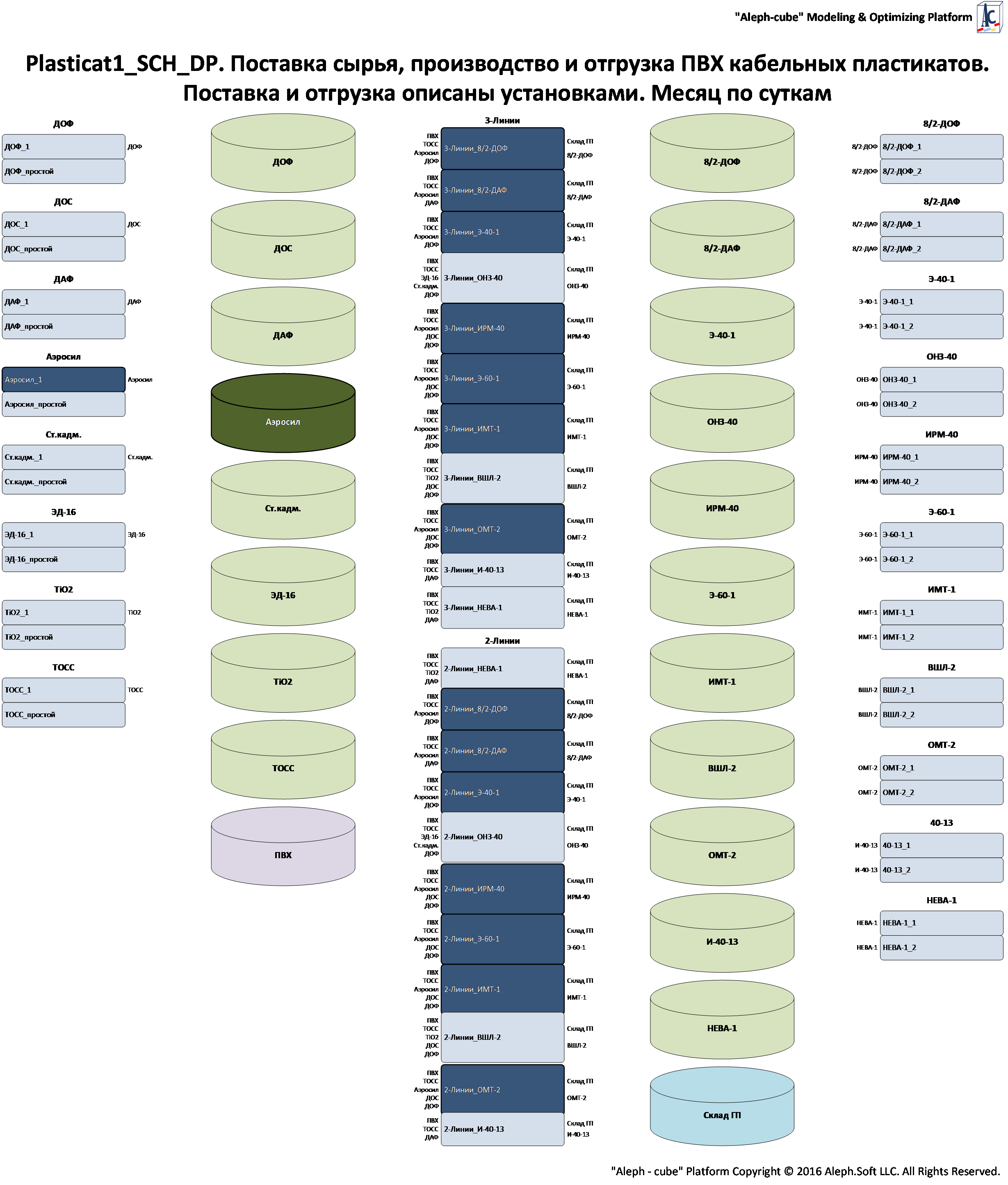 Производства и упаковки продукции – кабельных пластикатов различных марок, состоящей из установок «3-Линии», «2-Линии», отражающих производство различных марок кабельного пластиката из исходного сырья на трех и на двух линиях приготовления и гранулирования композиции вместе со смесителями суспензии, поставляющими для них суспензию. Операциями установок являются выпуск определенной марки кабельного пластиката по заданной рецептуре. Входными потоками операций являются сырье – «ПВХ», пластификаторы и стабилизаторы с предыдущей стадии, используемые в производстве определенной марки кабельного пластиката. Выходными потоками операций являются произведенный кабельный пластикат соответствующей марки, продублированный в емкость «Склад ГП» для учета ограничений на общий склад под готовую продукцию.
