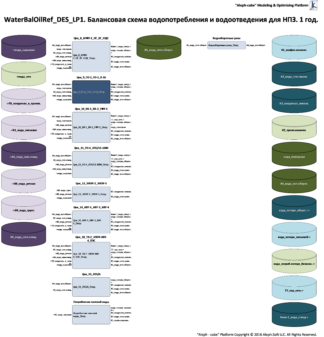 Отдельные цеха, системы и установки НПЗ моделируются отдельными установками, которые независимо потребляют разные виды воды, создавая разные виды сточных вод, которые очищаются на очистных сооружениях и в дальнейшем повторно используются либо отводятся.
