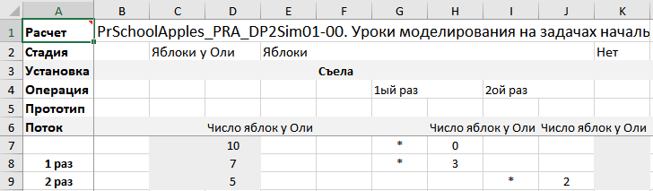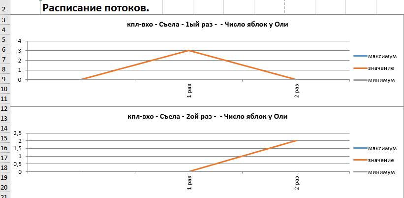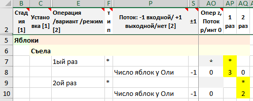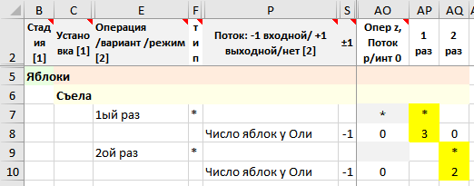 • Заданы «фрагменты решения» – съедает 1й и 2й раз, и потоки – число съеденных яблок.