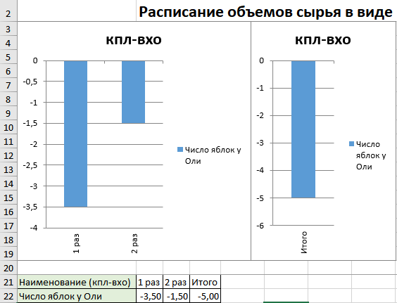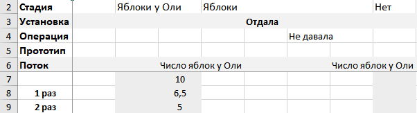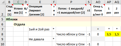 То же, что и вариант 01-01, но оба раза, и «сначала», и «потом», описываем переменным от времени потоком одной операции «1ый и 2ой раз», число яблок дробное.