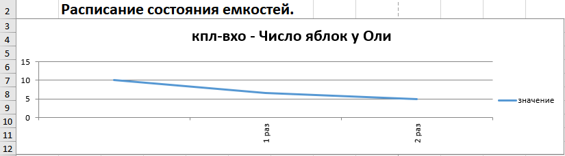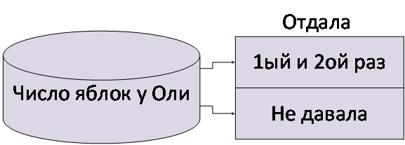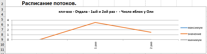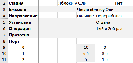 • Заданы «фрагменты решения» – 1й и 2й раз, и потоки – число отданных яблок.