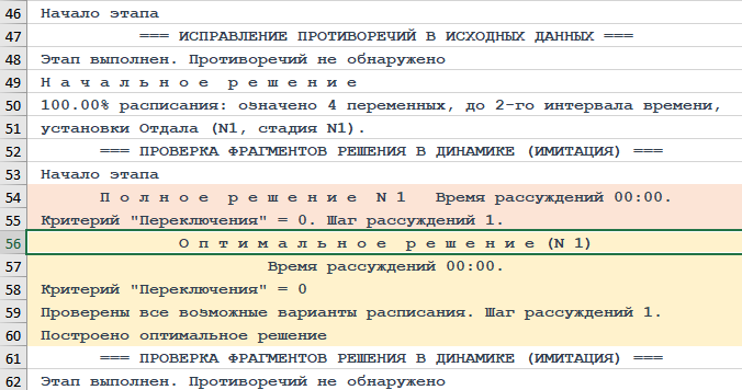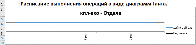 Оба шага, и 1ый раз «сначала», и 2ой раз «потом», описаны переменным от времени потоком. Операции при этом не переключаются. Поэтому, чтобы увидеть диаграмму Ганта для расписания выполнения операций, нужно поменять значения двух опций на листе «Опц» с 0 на 1: